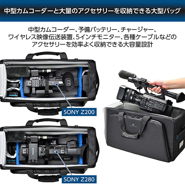 [主な特徴] 中型カムコーダーと周辺アクセサリーを効率的に収納できる、プロの現場での使いやすさを追求した大容量ショルダーバッグです 機内持ち込みサイズに対応する無駄のないスクエアデザインに、6面すべてに厚みのあるクッション材とボード材を内蔵した堅牢な構造が機材をしっかりと保護します 大きな開口部は機材を一覧しやすいだけでなく、カメラをすばやくスムーズに出し入れ可能 また、水に強い生地素材と止水ファスナーを採用しているため、急な天候変化に見舞われる屋外ロケでも安心して持ち運べます ※水の侵入を完全に防ぐものではありません 中型カムコーダーとアクセサリーを効率よく収納 ・メイン収納部は、中型カムコーダーに加えて、予備バッテリー、チャージャー、ワイヤレス映像伝送装置、5インチモニター、各種ケーブルなどのアクセサリーを効率よく収納できる大容量設計です ・また、内装には明るいグレーを採用しているため、車内や暗所での作業時でも収納物が見やすく、スムーズに作業できます シネマカメラと交換レンズの収納にも対応 ・メイン収納部は、レンズを装着したシネマカメラ本体に加え、交換レンズを縦向きに2本収納できる十分な高さを確保しています ・シネマカメラと複数のレンズを効率的に持ち運び、撮影現場でのレンズ交換にも迅速に対応できます 一眼カメラ用大型レンズの収納にも対応 ・中仕切りのレイアウトを調節することで、一眼カメラ用の大型レンズの収納にも対応します ・600mm F4クラスの超望遠レンズをフード逆付けで収納できるほか、300mm F2.8クラスの超望遠レンズを装着したプロ用一眼カメラをフード順付け でそのまま収納することも可能です 移動時のズレを防ぐ固定ベルト ・移動中のカメラの揺れを防止するため、機材固定ベルトを装備しています ・このベルトは、内部で取り付け位置をスライド調節できるため、収納する機材のサイズや形状に合わせて最適な位置でしっかりと固定でき、大切な機材を保護します フットスタンドとターポリン素材で安心の底面仕様 ・汚れや水に強いPUコーティングポリエステル素材をメイン生地に採用しています ・さらに、底面には防水性に優れたターポリン素材を使用し、直接地面に接することを防ぐフットスタンドを備えているため、ぬかるんだ場所でも安心してバッグを置いて撮影に集中できます ・付着した汚れも簡単に拭き取れるので、お手入れも簡単です ※水の侵入を完全に防ぐものではありません 三脚を取り付けできる格納式ベルト ・トップフレーム両端のポケット内に、操作性に優れたレバーロック式の固定ベルトを装備 ・ベルトを引き出すことで、三脚やウェアなどをバッグにしっかりと固定できます ・未使用時はポケットにすっきりと格納でき、外観を損ないません 肩の負担を軽減する大型ショルダーパッド ・ショルダーバッグ用の着脱式ショルダーベルトには、滑り止め付きの大型ショルダーパッドを装備 ・肩にしっかりとフィットし、長時間の使用でも肩への負担を軽減します キャリーオンホルダー ・背面には、キャリーケースのハンドルを通せるキャリーオンホルダーを搭載 ・旅行や出張撮影など、荷物が多い移動時に快適な運搬をサポートします フットスタンドとターポリン素材で安心の底面 ・底面には、バッグの自立をサポートし、直接地面に接することを防ぐフットスタンドを装備 ・底面素材には、防汚・防水性に優れたターポリンを採用しています ・ぬかるみなどの悪条件下でも安心してバッグを置いて撮影に集中できます フレキシブルな中仕切り ・収納物に合わせて位置調節や着脱が可能な大小2サイズの中仕切りを備えています ・小型の中仕切りは、縦、横どちらの方向にもフレキシブルに曲げて使えるので、レンズなどに沿わせて配置したり、バッテリーや小物が移動中に動かないよう、蓋のようにかぶせたりすることで、機材をしっかりと固定できます 便利な各部外部収納 ・撮影現場で役立つ収納スペースを各所に備えています ・背面には、A4サイズのクリアファイルを収納できるスリムなポケットを装備 ・また、左サイドにはメジャーやテープ類などのツールを収納できるマチ付きポケットを、右サイドには名刺が収納できる専用ポケットを備え、細かなアイテムも整理して持ち運べます 樹脂製ハンドル&リングプラーでスムーズな開閉操作 ・天面の開口部は、しっかりと握れて開閉時に安定した操作を可能にする樹脂製ハンドルとダブルファスナーを採用し、一気に大きく開くことが可能です ・また、各開閉部のファスナーには、グローブを装着したままでも指をかけやすく、スムーズに開閉できるリングプラーを採用しています マグネット式で静音性と操作性を両立 ・ハンドルカバーと天面のメイン開口部にはマグネット式を採用 ・面ファスナー式に比べて開閉が簡単で、音も発生しないため、静音性が求められる撮影現場で特に重宝します 大