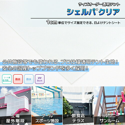 日よけテント・透明テント・オーダーテントシート【シェルパクリア】0.55mm厚・透明 [幅299〜450cm][長さ151〜200cm] 引張強度100kgfクラス テント屋根・間仕切で使える 透明のテント膜材 商業施設 テーマパーク 屋外プール エントランス 黄変防止 防汚 紫外線 UVカット