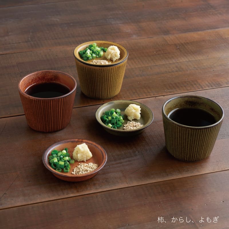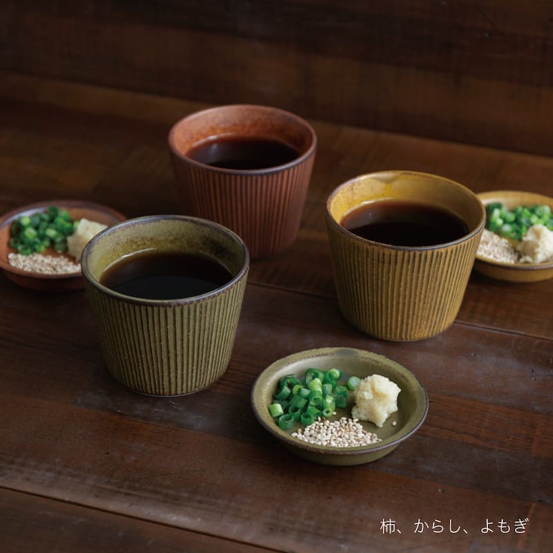 [検索キーワード] 食器 蕎麦猪口 そばちょこ そば猪口 カップ おしゃれ かわいい 日本製 マット ターコイズ ブラック 黒 赤 よもぎ からし 伝統 シンプル 和風 和モダン 美濃焼 磁器 白磁 新生活 薬味皿 コンパクト そうめん そば うどん つけ麺 スタッキング 重なる 便利そばちょこ 多彩な釉薬の表情と使い勝手の良いサイズ感。 そばやうどん、そうめんなどのつけ麺はもちろん、副菜や茶碗蒸しなどマルチに使いやすいアイテムです。 そばちょこと薬味皿、お揃いでセットでの販売です。 色:柿、からし、よもぎ 色:黒御影、根来 その他「そばちょこ」はこちら > 商品情報 原産国 日本 産地 岐阜県 土岐市(美濃焼) 素材 磁器 サイズ(満水) ちょこ:φ82×H63mm 180cc 薬味皿:φ85×H17mm レンジ 可 食洗機 可 注意事項 ・お使いのパソコンのモニターによって色合いが微妙に異なる場合があります。 ・焼き物の特性上、製品によって多少サイズが異なる場合があります。 ・食洗機のご使用の際、詰め込みすぎは破損の原因となりますのでご注意ください。 [検索キーワード] 食器 蕎麦猪口 そばちょこ そば猪口 カップ おしゃれ かわいい 日本製 マット ターコイズ ブラック 黒 赤 よもぎ からし 伝統 シンプル 和風 和モダン 美濃焼 磁器 白磁 新生活 薬味皿 コンパクト そうめん そば うどん つけ麺 スタッキング 重なる 便利
