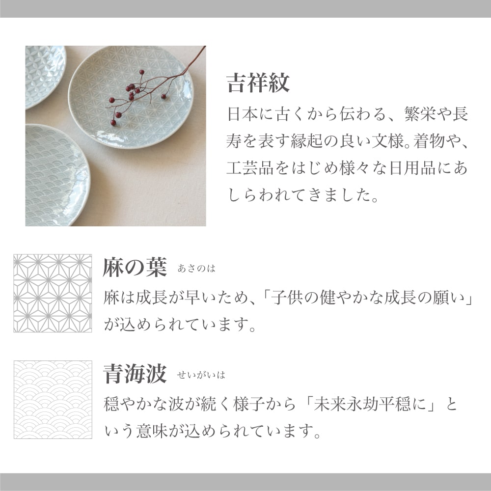 [検索キーワード] 食器 皿 そばちょこ 蕎麦猪口 カップ 箸置 プレート丸 角 皿 正方形 低い リム 縁起 和柄 吉祥 伝統 レリーフ 七宝 麻の葉 唐草 市松 鱗 青海波 模様 シンプル モダン 上品 日常使い グレー 灰色 正月 おもてなし おせち お祝い ハレの日 海外 ギフト 贈り物 出産祝い 引っ越し祝い 母の日 父の日 実用的 陶器 磁器 やきもの ブランド 上質 小田陶器 oda pottery madeinjapan 日本製 美濃焼吉祥 - kissho - 特別な日もそうでない日も 「ハレとケ」の暮らしを彩る縁起の良いうつわ。 日本に古くから伝わる「吉祥紋」。 繁栄や長寿を表す縁起の良い文様として着物や工芸品をはじめ、さまざまな日用品にあしらわれてきました。 その細やかで美しい文様を熟練の型職人がひとつひとつ手彫りし、心を込めてうつわに仕上げました。 明るいグレーカラーで日常使いにも馴染みやすく、お祝いの贈り物などにもおすすめのアイテムです。 ▼ Nem itmes! 吉祥シリーズに新しくアイテムが登場しました! 27リム皿・ 23皿・ 10角皿・ 14.5角皿・ 箸置き・ 9フタ小皿・ 8.5タンブラー・ 11.5蓋物・ 8.5切立カップ・ ソーサー 27リム皿(麻の葉) 12小皿 14.5角皿、10角皿、 8.5猪口カップ、 箸置き 12小皿、 8.5猪口カップ(麻の葉) 8.5猪口カップ(唐草)、 soso そそ 26正角皿、 コワケミニ 2つ仕切り皿 19リム皿(七宝) 19リム皿(鱗) 「吉祥 -kissho-」シリーズ一覧はこちら > 商品情報 原産国 日本 産地 岐阜県 瑞浪市(美濃焼) 素材 磁器 サイズ W53×D53×H10mm レンジ 可 食洗機 可 注意事項 ・お使いのパソコンのモニターによって色合いが微妙に異なる場合があります。 ・焼き物の特性上、製品によって多少サイズが異なる場合があります。 ・食洗機のご使用の際、詰め込みすぎは破損の原因となりますのでご注意ください。 [検索キーワード] 食器 皿 そばちょこ 蕎麦猪口 カップ 箸置 プレート丸 角 皿 正方形 低い リム 縁起 和柄 吉祥 伝統 レリーフ 七宝 麻の葉 唐草 市松 鱗 青海波 模様 シンプル モダン 上品 日常使い グレー 灰色 正月 おもてなし おせち お祝い ハレの日 海外 ギフト 贈り物 出産祝い 引っ越し祝い 母の日 父の日 実用的 陶器 磁器 やきもの ブランド 上質 小田陶器 oda pottery madeinjapan 日本製 美濃焼
