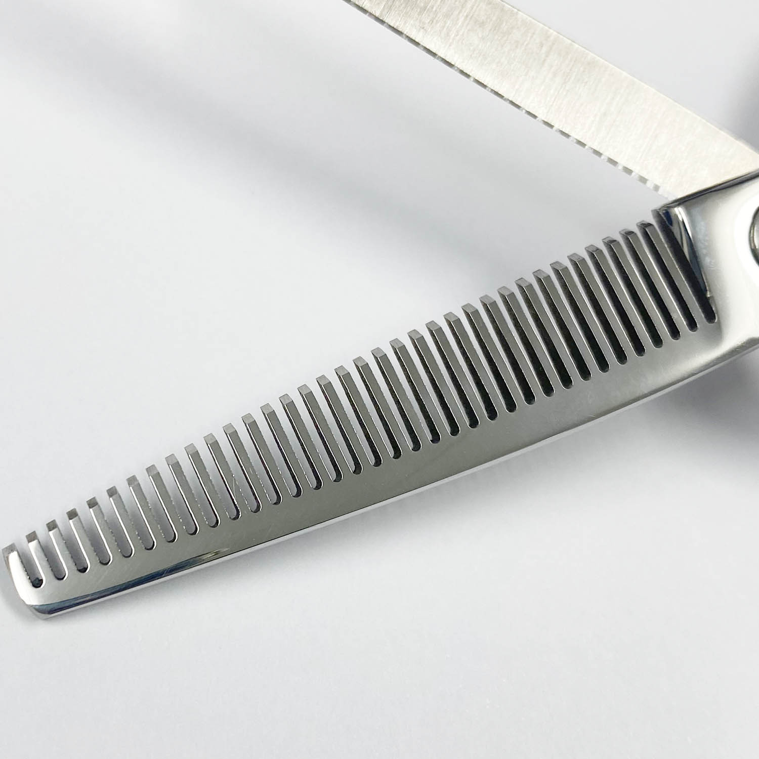 本格鋼材420Cを採用しプロの方達が使用するハサミを元に作られています。大量生産する事で低価格、高品質な商品に仕上がりました。初心者でも毛を引っぱって痛いと言われずプロ仕上げを再現できる特殊形状のセニングです。 セニングのスキ率は15%前後と使いやすく、カットラインが出にくいので初心者の方にも安心してお使い頂けます。 持ちやすい最新のエルゴノミクスハンドルのセニングを採用しているので ご家庭でのカットに最適な商品です。 ※刃がカミソリのように鋭利になっていますのでご使用、保管には十分にご注意下さい。 寸法 セニング 6.0インチ 全長173mm 刃渡り71mm 指穴 動刃24mm×20mm 静刃18mm×22mm 重さ 57g (スキ率15%前後※毛量や毛質、使い方によりスキ率は変わります。) ウェット、ドライどちらも可 サイズ 6.0インチ 材質 H2 ※ 全長とは小指掛けから刃先までの長さです。 ※ 刃渡りとはネジの中心から刃先までの長さです。 ※ 毛質や使い方によってスキ率は変わります。 ※※送料無料商品についてのご注意事項※※ メール便送料無料商品につきましてはメール便(ネコポス便)での配送となります。 商品説明欄の配送方法にて【メール便送料無料】をご選択して頂き ご購入手続きにて【メール便[特定送料](ヤマト運輸)】のご選択をお願い致します。 なお、代金引換をご利用の場合ネコポス便のご利用は出来ず宅配便(有料)での配送となります為 送料無料での配送をご希望の場合は代金引換以外のお支払い方法をお選びください。 また、送料無料のネコポス便はポストへの投函で配達終了となりますので手渡しではありません。 日時のご指定などはお受けしておりませんので予めご了承ください。 ※※宅配便(有料)をご希望のお客様※※ ご購入手続き画面にて配送方法をご選択できます。 宅配便をご希望のお客様、代金引換をご選択のお客様は【宅配便】をご選択ください。 配送料金に関しましては地域により金額が異なります。 事前に【利用ガイド】をご確認頂きますようお願い致します。 ▲シザーの選び方▲ 「商品のサイズやハンドルの違いがよく分からない・・・」そんなお客様は、以下のページをご参照ください。 シザーの選び方↓↓↓お好みのものがみつかったら早速お買い物!↓↓↓ PPシリーズ CPシリーズ DPシリーズ JPシリーズ XPシリーズ ↓↓↓プロ用シザーと同素材のワンランク上のVPシリーズ↓↓↓ ☆こちらもチェック☆【ガタガタにならない】サロンに行ったような前髪が自宅で作れる!!前髪専用シザー 単品でのご購入の場合は下記より通常価格にてお買い求めくださいませ。 DEEDS HC02 保管ケース 2丁入 ブラック DEEDS HC02 保管ケース 2丁入 ホワイト