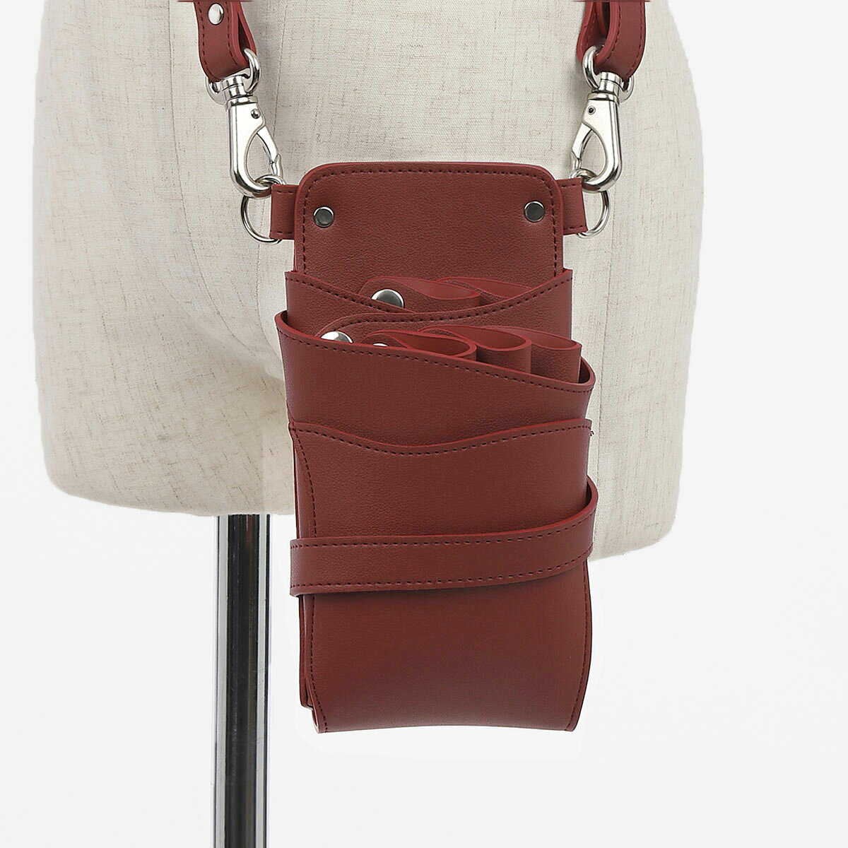 日本の美容師さんを熟知した国内のシザーケースメーカーが1からすべて考案。 素材・デザイン・カラー・機能性・細部にまでこだわりました。 アシスタントからスタイリストまで長くお使いいただけます。 ■220×110×80 ■PUレザー ■0〜5丁入 ■カラー レッド ■大容量ポケット付き ■ダッカールベルト ■専用ベルト付き(腰巻き&肩掛け兼用) 全長64cm~123cm程度 ※色やロットによってサイズに若干の差異がある場合がございます。 マットな風合いのレッドのPUレザーに、シルバーの金具を組み合わせたお洒落なシザーケースです。 シザーホルダーは合計5丁収納可能、全て取り外し可能となっており、用途にあわせてカスタマイズできます。(後列3丁、前列2丁) 衛生的にご使用いただける便利なお手入れ機能付き。 ▼0~5丁入れ dpプラートの特徴▼ ・裏面にメモ帳やスマホを収納できるポケット付き ・丁数が自由にカスタマイズ可能(後列3丁、前列2丁) ・衛生的にご使用いただける便利なお手入れ機能付き ▲コメント▲ 深みのあるレッドにシルバー金具を合わせ、シックな印象に仕上げました。、差し色にも最適なカラーです。 アシスタント時には、シザーホルダーを全て外し、余ったスペースにはメモ帳や小物などをたくさん収納する事が出来ます。 スタイリストデビュー時には、シザーサックに付け替えて必要な丁数のシザーを収納出来ますので、ご自身のニーズに合わせてシザーケースのカスタマイズが可能です。 ※1枚目のハサミ、コーム、ダッカールは付属しません。▼着用イメージ ▼カラーバリエーション一覧 【こちらもおすすめ】dpシリーズ 0〜5丁入れシザーケース オルビア 【こちらもおすすめ】dpシリーズ 4丁入れシザーケース トリノ
