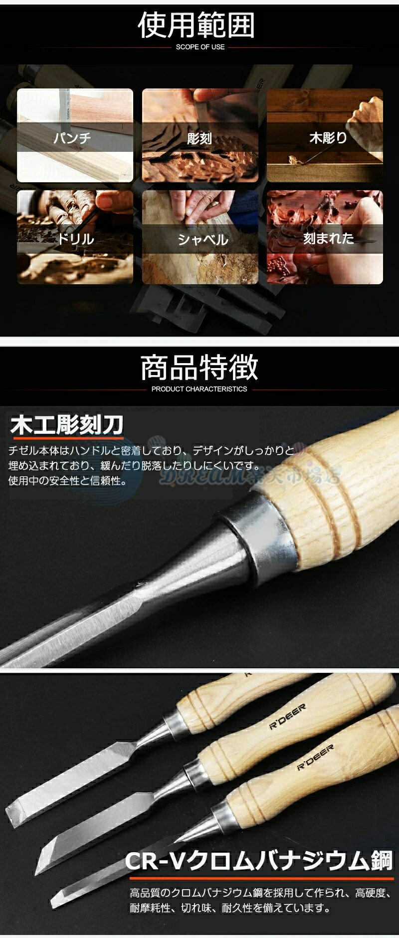 商品名 木製彫刻刀 サイズ 340×260mm 彫刻刀内容 ・平刀2本 ・アークナイフ3本 ・斜刀(左右)1本 ・三角刀3本 ・内部アークナイフ1本 ・シミター2本 ブレードサイズ ・平刀( 6mm 13mm ) ・アークナイフ( 10mm 18mm 25mm ) ・斜刀(左右)( 12mm ) ・三角刀( 14mm 16mm 16mm ) ・内部アークナイフ( 6mm ) ・シミター( 12mm 19mm ) 製造国 中国 注意点 【色・サイズについて】 ◆商品写真はできる限り実物の色に近づけるよう徹底しておりますが、 お使いのモニター設定、お部屋の照明等により実際の商品と色味が異なる場合がございます。 ◆サイズの測り方はスタッフ間で統一しておりますが、若干の誤差(約2〜3cm前後)が生じる場合がございます。 【商品について】 ◆生産時期により、色・サイズ・デザインが多少が異なる場合がございます。あらかじめ御了承下さい。 ◆生地のカッティングにより画像と異なる場合がございます。 同商品、同色におきましても色(染料)やロットによって伸縮性・伸び率、裁断上ずれなどが生じてしまう現象があります。 ◆ご存知の通り海外の工場での縫製は日本の工場と比べますと、細かい点で雑に見えるものがございます。不良品ではありません。 納期について ◆ご入金確認後、3-5営業日発送予定。(キャンセル・ご変更等のご連絡は、入金後の2日以内にお願い致します。) ◆注文個数によりお届け日が変わることがあります。至急の場合、予め使用希望日をご連絡ください。 ◆天候や交通事情等の都合により配送期間は前後いたします。予めご承知下さいませ。 在庫について ◆当店は複数店舗で在庫を共有しております。偶々ご注文を頂いた時点では販売中と 表示されていた商品でも、在庫切れとなる場合がございます。その場合、その旨をメールにてご連絡後、ご注文をキャンセルさせていただくことになります。その際には、ご理解賜りますよう申し上げます。 返品・交換について ◆返品・交換の場合、未使用の商品のみ到着日から7日以内にご連絡頂ければ、対応させて頂きます。万が一お届け商品がご注文内容と異なったり、欠陥、汚損があった場合、交換、もしくは返金させて頂きます。