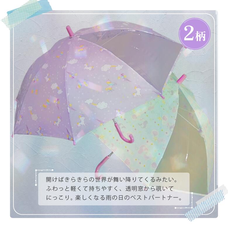 長傘 ゆめかわ パステルカラー かわいい カワイイ ユニコーン マーメイド リボン 虹 星 人魚 軽い 丈夫 グラスファイバー骨 安全ストッパー キッズ ジュニア 子ども 女の子 カサ 雨具 レイングッズ 手開き傘 透明窓 お名前欄 入園入学準備 通学 ユアーズアーミーワールド