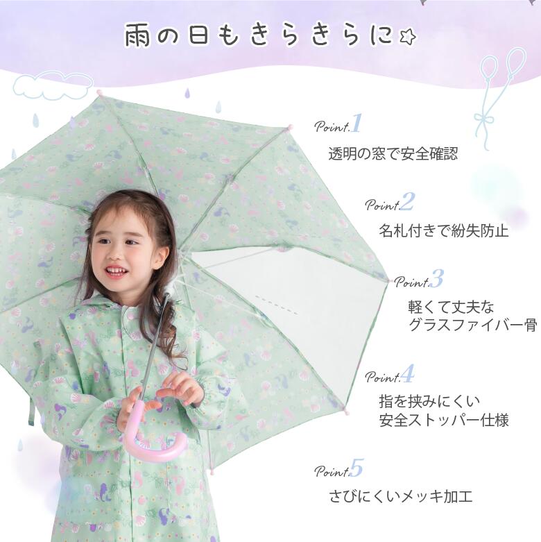 キッズ雨傘 ゆめかわデザインの紹介 ゆめかわデザインがかわいい雨の日が楽しくなる手開き開閉傘。:゜・*☆彡 可愛さ&安全性を兼ね備えたアンブレラ。 ゆめかわいいコーデを楽しめちゃうレインアイテムです。 ユニコーン・マーメイド・リボンなどゆめかわモチーフがたくさんつまったカワイイ傘。でもカワイイだけじゃないんです。前方が見やすい透明窓は、視界が暗くて悪い雨の日も安全安心で雨の日のお出かけや梅雨時期の通学にぴったり。傘の開閉時に手を挟まないようにした安全ストッパーや耐久性に優れたグラスファイバー骨など、レイングッズとして十分な機能性が備わっています。 春夏秋冬ヘビーローテーション! 雨の日でもゆめかわ気分で楽しく出かけよう☆*・*゜ おすすめポイント ■どこからみても可愛い総柄ゆめかわふんわりやさしいデザイン。 ■一部が透明窓になっているので前方が見やすく安全安心。 ■コロンと丸いつゆ先はカワイイ&安全面もばっちり考慮。 ■石づきは金属リングで補強してあるのでツンツン地面についても長持ち。 ■バンド部分の角丸の面テープは引っ掛かりにくく簡単に傘をまとめられ、内側にお名前ネームつき。 オススメコーディネート ベーシック/ファンシー/ミニマル/ガーリー/フェミニン 360度どこから見ても100%かわいいゆめかわアンブレラ。 パっと開くだけで一気にユメカワ気分で明るい気持ちに♪ ガーリーなコーデにはもちろん、シンプルなコーデも一気にポップで夢かわいくなりますよ。 おすすめ着用シーン ■雨の日の普段使いに 雨の日のお買い物や、お出かけ着と一緒に。やさしいパステルカラーで雨の日のお出かけを楽しくしちゃおう!耐久性抜群のグラスファイバー骨を使用しているのでながーく使えます。 ■雨の日の通園・通学に 駒(生地)の一部分がビニールの透明窓になっているので、視界の悪い雨の日の通園通学も安全です。 ベルト内側におなまえ欄があるのもうれしい♪ オススメ年代 保育園児 幼稚園児 未就学児 小学生 10代 ※キッズ、ジュニア、女の子、男の子、幅広い世代で可愛い人気のオシャレな夢かわいいレインアイテム! 兄弟姉妹やお友達でおそろいにするのもOK。 素材・特徴 ゆめかわ手開きカサ ポリエステル生地100% 一部塩化ビニル樹脂仕様 透明窓付き/お名前ネーム欄あり/グラスファイバー骨/安全ストッパー設計/丈夫な石づき/さびにくいメッキ加工 サイズ ■【Mサイズ/親骨長さ:50cm 重さ:290g】 柄(カラー) レインボーユニコーン(ライトパープル系)/マーメイドライン(ミントブルー系) ※選べるおしゃれなカラー、デザインでお洒落を楽しもう。色違いや友達とおそろいにするのもおすすめ。 可愛さがぎゅっと詰まったデザインでお気に入りのカラーをお選びいただけます。 性別 女の子 男の子 男女兼用 バリエーション ■レインボーユニコーン (ライトパープルをベースにふわふわの雲や星、虹、風船などが浮かぶ空をユニコーンがお散歩しているようなカワイイかさ) ■マーメイドライン (さわやかなミントブルーをベースにおしゃれなマーメイドのシルエット、貝殻、リボン、宝石や星がきれいに並んだかわいいカサ) ご注意 こちらの商品はサイズ・カラーのご交換サービスは対象外とさせて頂いておりますのでご了承ください。透明窓付き長傘 【パステルカラー×ポップでキュートな雨傘】