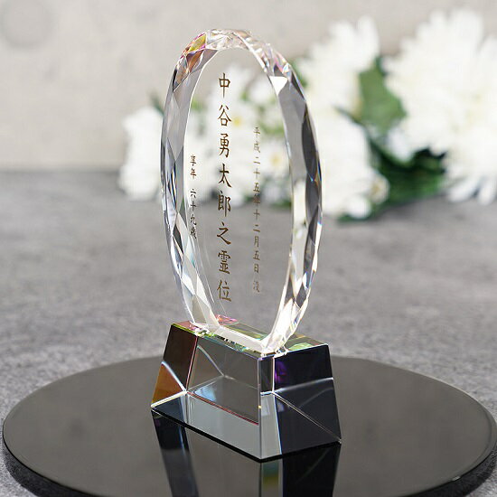[本体サイズ]:商品画像をご参照下さい。 [材質]:クリスタルガラス(ホログラム加工付き) ※有害な鉛成分を一切含まずに従来のクリスタルガラスと同等の透明度と輝きを実現した地球環境に優しいエコロジークリスタルガラスを使用。 ※表面に傷が付きにくい為、長期間に渡り抜群の美しさと透明度が持続します。 ※熟練の職人が1点1点手作業でカット・研磨しております。 [文字加工]サンドブラスト彫刻 ※ガラス表面に直接文字を彫刻します。 【ご注文時の注意】 (1)すべての選択項目をお選び下さい。 (2)戒名・没年月日・没年齢など位牌に刻む文字内容は、ご寺院様にご確認の上、備考欄に必ず記入して下さい。 (3)戒名の下の「位」、没年月日の下の「没や寂など」、没年齢の上の「行年・享年」・下の「歳や才」なども、ご寺院様にご確認の上、お知らせ下さい。 (4)位牌作成の前に、弊社より「レイアウト図(完成予想図)」を作成しお知らせ致します。お客様より確認をいただけ次第、ご注文商品の製作に入ります。 (5)「文字の色入れ(有料オプション)」をご希望のお客様には、ご注文後、追加料金分を修正して弊社より再度メールにてお知らせいたします。手作業で一点一点丁寧にカットし研磨されたクリスタルガラスに日本の職人が丁寧に心を込めて戒名を彫刻致します。