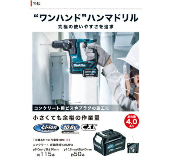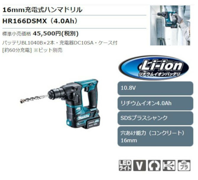 先端工具はこちらから 電気用品安全法に関する記載事項 PSマークの種類PSEマーク 届出事業者名株式会社マキタ メーカー希望小売価格はメーカーカタログに基づいて掲載しています マキタ HR166DSMX 16mm充電式ハンマードリル スライド式10.8V(4.0Ah) セット品 (本体・バッテリBL1040B×2個・充電器・ケース付) コードレス ◆