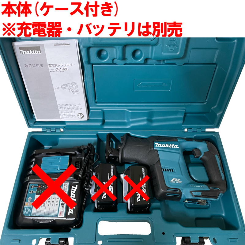 \バッテリーセット特集は下記バナーをクリック/ 商品仕様 取り回し性と切断能力を両立、 ワンハンドレシプロソー ※レシプロ刃別売 別売品 A-78190 BIM70 全長152mm(木材解体用 釘入り可) A-78209 BIM71 全長305mm(木材解体用 釘入り可) A-78221 BIM73 全長200mm(鉄・ステンレス用) A-78243 BIM75 全長300mm(鉄・ステンレス用) A-78259 BIM76 全長152mm(木材・鉄・ステンレス用) A-78237 BIM74 全長250mm(鉄・ステンレス用) HM3 A-61662 (2枚入)全長228mm (鋳鉄管・複合材用) HM4 A-61678 (2枚入)全長305mm (鋳鉄管・複合材用) など 18Vリチウムイオンバッテリ BL1830B(A-60442) 3.0Ah BL1850B(A-59900) 5.0Ah BL1860B(A-60464) 6.0Ah DC18RF 14.4V/18V用 急速充電器 検索ワード 型番:JR187DRGX JR187DZK JR188DRGX JR188DZK JR189DRGX JR189DZ JR001GRDX JR001GZ JR002GRDX JR002GZ JR3051T JR3061T Makita 正規店 純正 正規品 新品 未使用品 コードレス セーバーソー --> ※レシプロソーブレード別売 メーカー希望小売価格はメーカーカタログに基づいて掲載しています マキタ JR188DZK 充電式レシプロソー 18V(※本体+ケース※バッテリ・充電器別売) コードレス ◆ \バッテリーセット特集は下記バナーをクリック/