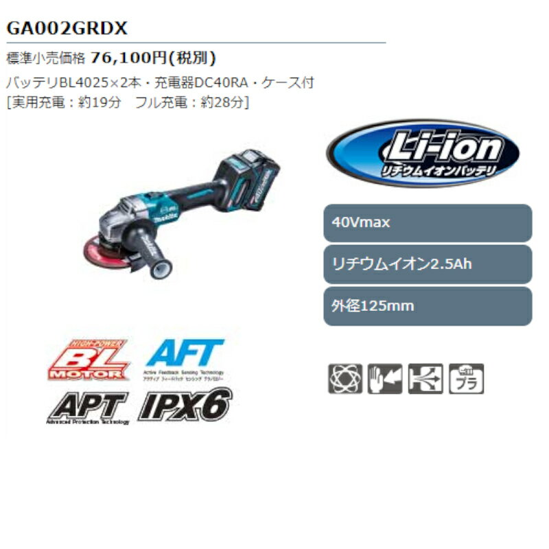 商品内容 本体、バッテリBL4025×2本・充電器DC40RA・ケース付 標準付属品 研削砥石36P・ロックナットレンチ35(782407-9) ・サイドグリップ 特記事項 40Vmaxでしか使用できません/外径125mm 電気用品安全法に関する記載事項 PSマークの種類PSEマーク 届出事業者名株式会社マキタ メーカー希望小売価格はメーカーカタログに基づいて掲載しています マキタ GA002GRDX 125mm充電式ディスクグラインダ(スライドスイッチ) 40Vmax(2.5Ah) セット品 コードレス ◆