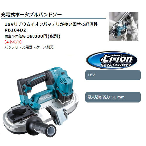 \バッテリーセット特集は下記バナーをクリック/ 商品内容 本体のみ(バッテリ・充電器・ケース別売) 標準付属品 ソーブレード(BIM、18山/インチ)、六角棒スパナ4・サイドグリップ 特記事項 最大切断能力 51 mm メーカー希望小売価格はメーカーカタログに基づいて掲載しています マキタ PB184DZ 充電式ポータブルバンドソー 18V (※本体のみ・バッテリ・充電器別売) コードレス ◆ \バッテリーセット特集は下記バナーをクリック/