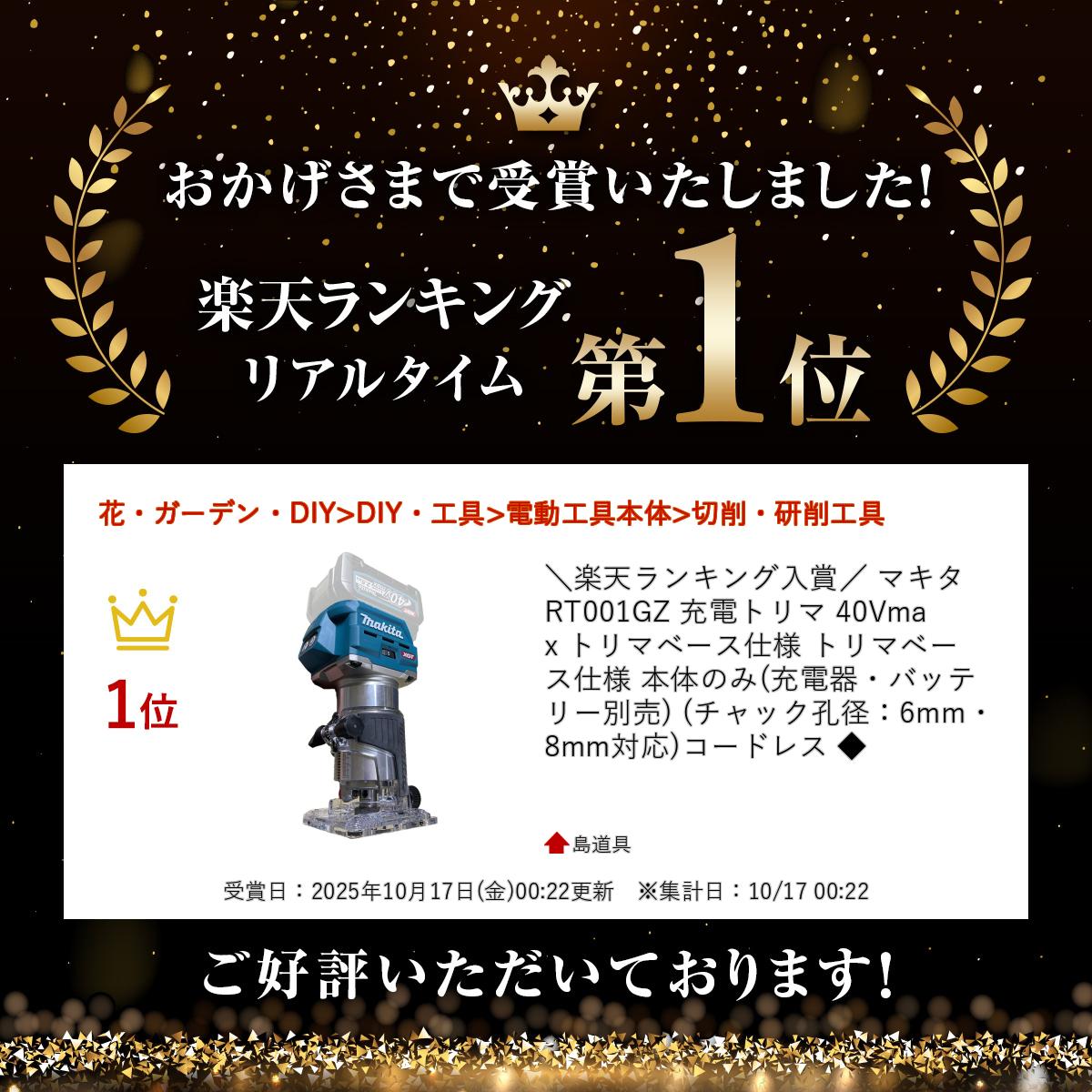 商品仕様 チャック孔径:6・8mm 回転数:10,000〜31,000min-1[回転/分] 電源:直流36V(40Vmax) ※電源の補足 ※40Vmaxは満充電時のバッテリ電圧を表しています。 1充電作業量(目安)パーティクルボード(厚さ9mm)約36m ※1充電作業量の補足 ※BL4025使用時。 本機寸法(長さ×幅×高さ):126×90×245mm 質量:2.0kg ※質量の補足 ※バッテリ含む。 標準付属品 ストレートビット6・ストレートガイド(トリマベース用) トリマガイド・ダストノズル(トリマベース用) テンプレットガイド10・コレットコーン8(軸径8mmビット用) スパナ22・13(各1本) メーカー希望小売価格はメーカーカタログに基づいて掲載しています マキタ RT001GZ 充電トリマ 40Vmax トリマベース仕様 トリマベース仕様 本体のみ(充電器・バッテリー別売) (チャック孔径:6mm・8mm対応)コードレス ◆