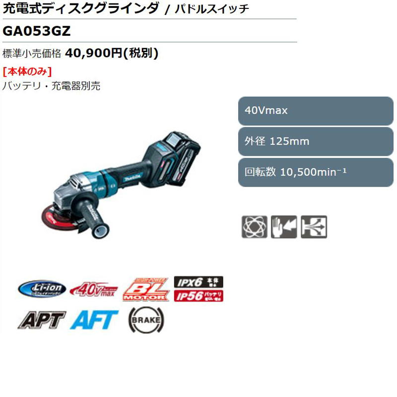 マキタ GA053GZ 125mm充電式ディスクグラインダ 40Vmax 本体のみ(充電器・バッテリー別売) (パドルスイッチ+ブレーキ・推奨バッテリ:BL4040F・BL4050F) ◆