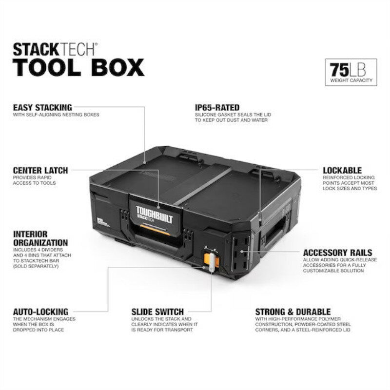●StackTech 独自のオートロッキングシステムで簡単にスタック&ロックが可能。 ●防水防水性の高いシリコンガスケットリッド。IP65規格 ●外部に衝撃に強いハイパフォーマンスポリマーとスチール構造。 ●持ち運び、取り出しを簡単にするフロントと両サイドのハンドル。 ●拡張性の高いStackTechコーナーアクセサリーレールが採用され、多彩な純正アクセサリーが取り付け可能です。 ●センターラッチ採用でスムーズな開閉。 ●左右2か所のロックホールで施錠可能(南京錠は付属しません)。 ●付属品:小物BOX(オープン)x2、小物BOX(フタ付)x2、小物ボックス用仕切りx4 ●最大収納重量:34kg ●サイズ 外寸:W53xD41xH18(cm) 内寸:W47xD35xH13(cm)