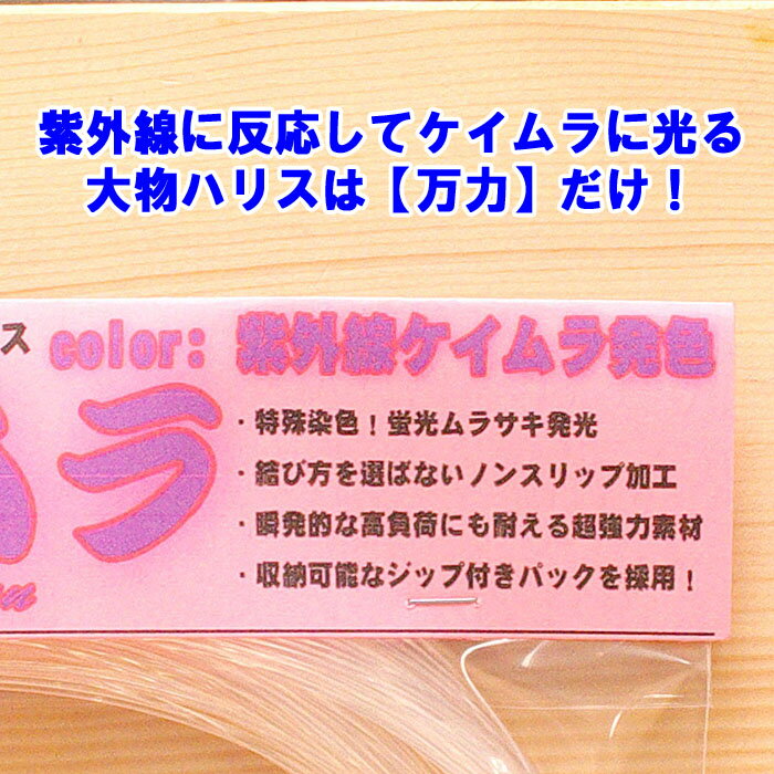 大物釣り師の間では強い!結びやすい!使いやすい!と好評な【万力】ブランドの大物ハリス。 その万力シリーズに何と紫外線に反応して発色するケイムラが登場しました♪ 攻めのアピール系ナイロン大物ハリス。 カンパチを初め青物にはケイムラが効く! まずはリーダーに使ってみてください。 落下中に大型魚にスイッチが入り興奮して追いかけてきます。 こちらは原糸に万力スーパークリヤー使ったソフトタイプになります。 同じケイムラ60号でも万力まぐろを原糸に使ったハードタイプもご用意しています。 サンプルを銭洲、神津島の泳がせカンパチで使った当店の常連様は明らかに違いが出たそうです。 (ハリス=見えなくする物)とは真逆の発想です。 例えば!何かケイムラに光るものが落ちて行く、何だろう?追いかけてみよう。 追いかけた先にムロアジが暴れているわけです。 今まで考えもしなかったです。