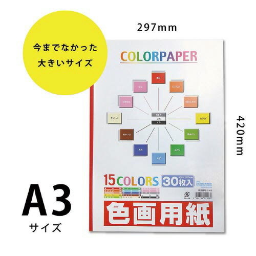 ●カラー/赤・緑・薄桃・橙・水・桃・薄橙・青・鼠・黄・茶・白・黄緑・クリーム・黒●サイズ/A3●寸法/タテ420×ヨコ297mm●紙質/色画用紙(再生紙使用)●坪量/122g/平方メートル●紙厚/約0.17mm●セット内容/15色30枚入メーカーの都合によりパッケージ及び内容量などが予告なく変更される場合があります