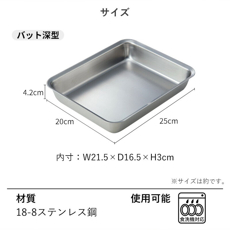 商品説明商品名ステンレス 角バット ざる セット サイズ【バット浅型】 サイズ:約W25.5×D20.5×H1.5cm 内寸:約W23×D18×H1cm 【バット深型】 サイズ:約W25×D20.4×H3.5cm 内寸:約W21.5×D16.5×H3cm 【角ざる深型】 サイズ:約W25×D20.4×H3.5cm 内寸:約W21.5×D16.5×H3cm 材質18-8ステンレス鋼 原産地中国 商品詳細●積み重ねやすい角型 ●浅型はフタとしても使用可能 ●油切り・水切りに便利な角ざる ●さまざまな調理に ●汚れが溜まりにくいフチでお手入れ簡単 ●丈夫で錆びにくいステンレス製 ●食洗機対応 注意事項※使用後は良く洗って乾燥させてください。 ※食器用洗剤を含ませたスポンジで洗い、硬いブラシなどは使用しないでください。 ※腐食する恐れがあるため漂白剤や磨き粉の使用は避けてください。 ※長時間水に浸さないでください。 ※ステンレスの製造上、細かな傷や継ぎ目・溶接跡がある場合がありますが、使用上の問題はございませんので予めご了承ください。 ※商品の色はモニターの具合で実物と若干異なる場合がございます。予めご了承下さい。 ※光、角度、撮影機器の演色などの理由により、色の見え方が異なる場合があります。 メーカー霜山株式会社 バリエーションバット浅型 バット深型 ざる深型 3点セット 検索用キーワードステンレス 角バット ざる セット 単品 バット 四角 角型 浅型 深型 フタ キッチン用品 料理 揚げ物 調理 水切り キッチンバット ステンレスバット ステンレスザル 下ごしらえ 天ぷら 野菜 食洗機対応 調理道具 角ザル 油切り 霜山両手鍋と五徳! 1980円〜 送料無料 ステンレス製で丈夫! 1580円〜 送料無料 素早く冷凍して鮮度を閉じ込める! 940〜1440円 食材が滑りにくく切りやすい! 1980円〜 送料無料