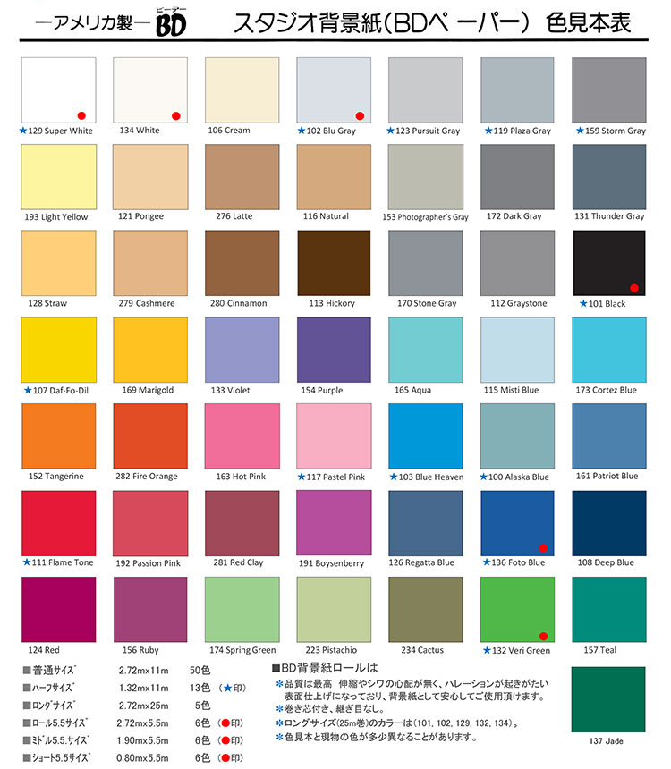 商品のお届けについて 配送地域により送料がかかる場合がございます。 送付先名は、会社名、団体名等をご記載ください。個人名の場合、別途追加送料がかかります。 宅配便でのお届けの場合、離島など一部地域によって別途中継料がかかります。 あらかじめご了承いただきますようお願いいたします。 製品保証 本商品はお客様都合の返品交換は承れません。ご了承の上、お買上ください。 スペック 商品名 BDスタジオ背景紙 レギュラーサイズ サイズ 2.72mx11m カラー 全50色 材質 紙 商品特徴 米国製BDペーパーのレギュラーサイズです。 幅が2.72m、長さが11mありますので、スタジオでの大型商品撮影や複数の人物撮影の時に便利です。(巻芯付・継ぎ目なし) 伸縮やしわの心配がなく、ハレーションが起きにくいスタジオ用背景紙です。 ●切断加工オプション ご注文時に「切断加工必要」をご選択いただきますと横幅をお好みのサイズに加工致します。 ・切断加工手数料として、1200円をご注文後に当店にて加算いたします。 ・切断は横幅のみとなり、長さの切断は承れません。 ・切断手数料は、1回の切断に対する手数料です。1本を2回切断する場合、手数料は×2となります。 ・必ず、「切断加工必要」をご選択いただき、ご希望の切断サイズをご記入ください。 ・お好みの切断加工サイズより、短い背景紙では承れません。 ★注意事項★ ※当ページの色見本は、カタログをスキャンしたものであり、現物の色と多少異なることがございますので、ご了承下さい。