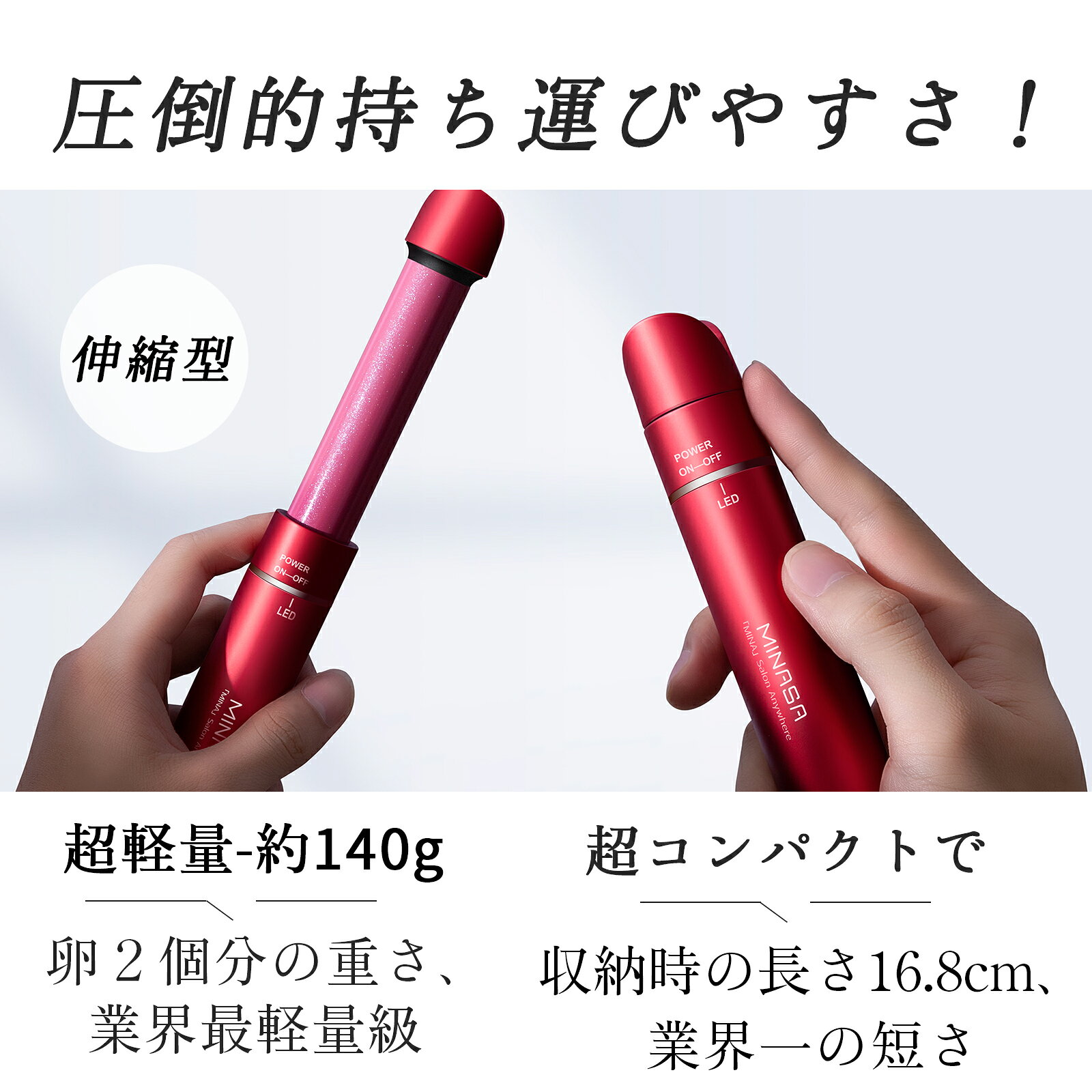 商品情報 ブランド MINASA(みなさ) 商品名 CARRY ROSE 2-WAYヘアアイロンカラークラレットおすすめポイント時空を超えたイメージキープ メイクお直しと合わせて、ヘアもお直し Minasa carry rose 2way ヘアアイロンが誕生 時空を超えたイメージキープ、いつでもどこでもヘアお直し メイクお直しと合わせて、ヘアもお直し ●【コンパクト】業界最軽量クラ、超コンパクトで持ち運び用、旅行用に特化し、どんな鞄にも楽々収納。 ●【美容師推奨】プロの美容師が推奨、美容サロンクオリティ。 ●【お出かけの必需品】ストレートもカールも楽々、マイナスイオンが発生。髪を守り、機内持ち込み可 ——機能充実、圧倒的持ち運びやすさ 、伸縮型、収納時の長さ16.8CM 、スマホの長さとほぼ変わらない ——マイナスイオン機能で髪の毛のツヤが出て見える 、ヘア直しのついでにダメージケアできる ——重さ約140g、卵2個の重さ、業界最軽量、持ち運びやすい、長時間使用でも疲れにくい ——本体と電源コード分離式で収納しやすい設計 、断熱ポート付きで楽々鞄に収納できる ——コンパクトなのに、カール、ストレート2way、髪がまとまり、アホ毛が立ちづらくできる 関連キーワード 超音波アイロン ヘアアイロン ヘアーアイロン ヘア-アイロン ヘアアイロン ストレート コードレスヘアアイロン ヘアアイロン カール ヘアアイロン 2way ヘアアイロン コードレス 充電式 ヘアアイロン 海外対応 ヘアアイロン ヘアアイロン 携帯 持ち運び ヘアアイロン 携帯 アイロン ヘア コードレス 多機能ヘアアイロン 携帯用 ストレート ヘアアイロン ヘアアイロン 旅行用 コンパクト ヘアアイロン 海外 旅行用 カールアイロン 携帯ヘアアイロン 旅行 ヘアアイロン ヘアアイロン トラベル 旅行 ヘアアイロン コンパクト ヘアアイロン トラヘアアイロン 旅行用ベル 海外対応 ヘアアイロン 母の日 プレゼント・ギフトborder="0">