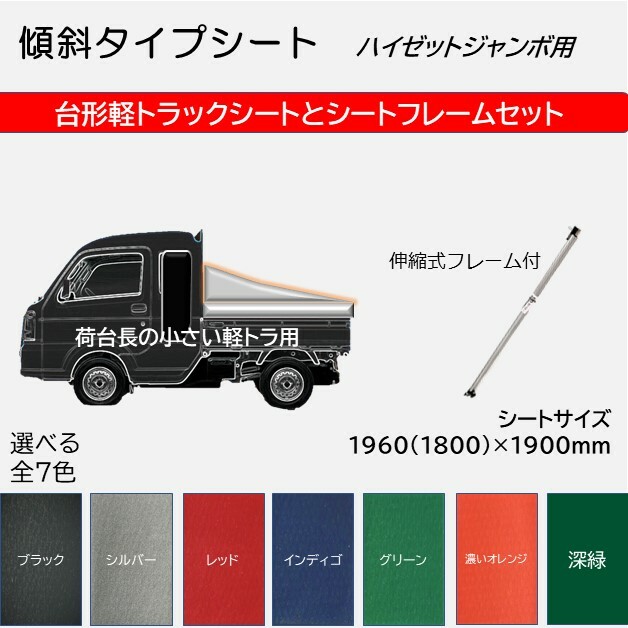 ダイハツ ハイゼットジャンボ用 国産 軽量軽トラックシートフレーム付 1.96m(後1.8m)×1.90m 傾斜・スロープ型 カラー全7色 荷台シートフレーム(シート荷台フレーム)付き