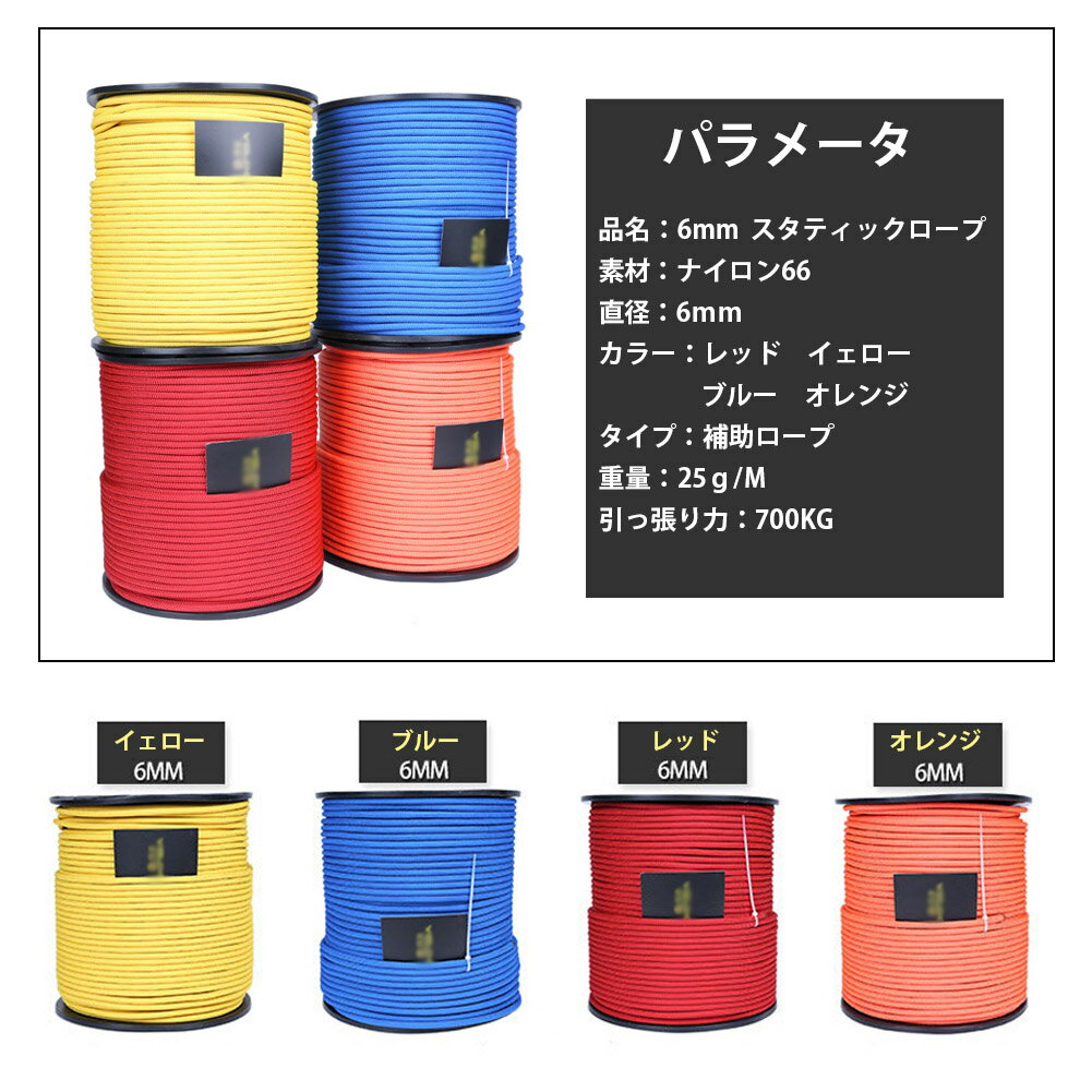 6mm 多目的ロープ ザイル ガイロープ 耐荷重700kg カラビナ 付き アウトドア キャンプ クライミング 補助ロープ 防災 安全 ロープサイズ:太さ 約6mm 長さ 約10m/20m/30m;素材:ナイロン66 内側の芯が密で、手がふっくらと感じられ、張力が強く、耐用年数が長い ソフト、それは容易結び目を結ぶために、最大コイルに柔軟になり、より良いグリップを有します。 【多用途・多機能・多目的】 トレッキングや渓流での移動、キャンプなどでは、テントやタープ、ハンモックの設営、洗濯物を干したり、犬をつないだりと大活躍のロープです。 海や川での釣り、セーリング、ツーリング、ハンティングなど様々なスポーツでもご利用いただけます。 その他、庭木の剪定、窓の清掃、雪下ろし、外壁の修理などの作業補助用として、荷物の固定や引っ越し時の荷下ろし、荷物の吊り上げなどの各種屋外作業用に、緊急避難用や風水害用の防水シートの固定など防災の備品としてなどマルチにご使用いただけます。 - 注:それはそれを使用する前に、結び目や傷されているかどうかをロープをチェックします。 ご注意:ご利用のモニター環境により、色合いが異なって見える場合がございます。送料について、全国送料無料になります。ただし、北海道は800円、沖縄は1500円の追加をいただきますが、ご了承のうえご注文ください。6mm 多目的ロープ ザイル ガイロープ 耐荷重700kg カラビナ 付き アウトドア キャンプ クライミング 補助ロープ 防災 安全 ロープサイズ:太さ 約6mm 長さ 約10m/20m/30m;素材:ナイロン66 内側の芯が密で、手がふっくらと感じられ、張力が強く、耐用年数が長い ソフト、それは容易結び目を結ぶために、最大コイルに柔軟になり、より良いグリップを有します。 【多用途・多機能・多目的】 トレッキングや渓流での移動、キャンプなどでは、テントやタープ、ハンモックの設営、洗濯物を干したり、犬をつないだりと大活躍のロープです。 海や川での釣り、セーリング、ツーリング、ハンティングなど様々なスポーツでもご利用いただけます。 その他、庭木の剪定、窓の清掃、雪下ろし、外壁の修理などの作業補助用として、荷物の固定や引っ越し時の荷下ろし、荷物の吊り上げなどの各種屋外作業用に、緊急避難用や風水害用の防水シートの固定など防災の備品としてなどマルチにご使用いただけます。 - 注:それはそれを使用する前に、結び目や傷されているかどうかをロープをチェックします。 ご注意:ご利用のモニター環境により、色合いが異なって見える場合がございます。送料について、全国送料無料になります。ただし、北海道は800円、沖縄は1500円の追加をいただきますが、ご了承のうえご注文ください。