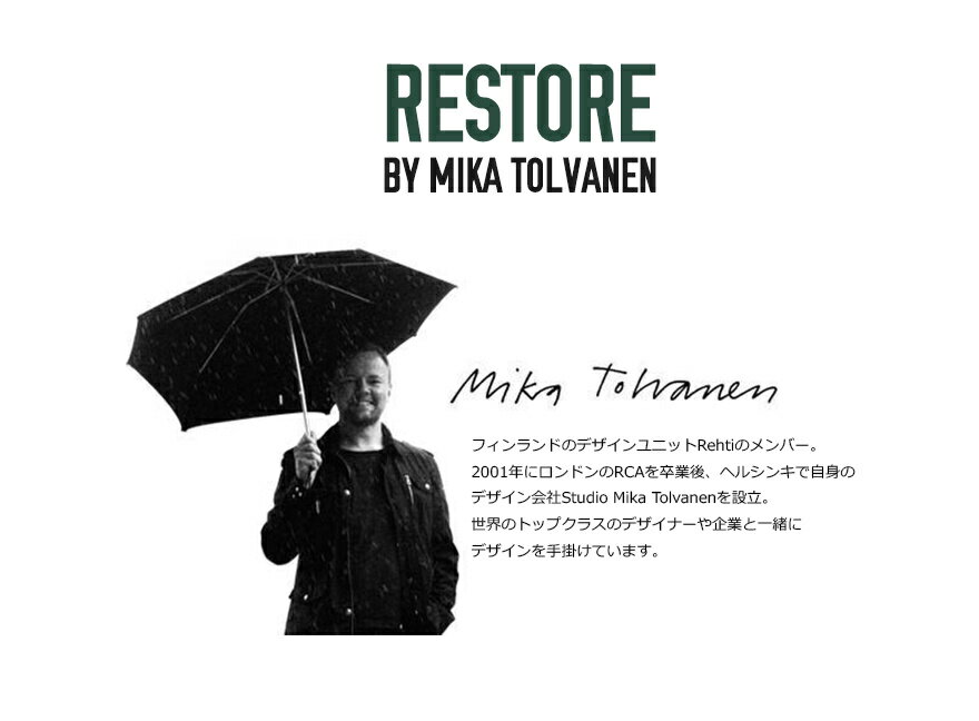 商品仕様 商品名 リストアトレイ サイズ W31 x D40 x H12cm 素材 ポリマーフェルト デザイナー Mika Tolvanen(ミカ・トルバネン)Muuto / ムート RESTORE TRAY / リストア トレイ 柔らかさの裏切り フェルト素材の外観から予想される柔らかさは、それを持った時、 「それは硬かったんだ!」と衝撃を与えます! 型崩れしないほどにが頑丈に形成されたフェルトは、 重ねておいたり、持ち運んだり、 小物入れとして必要な要素を完備し、 かつフェルト素材という遊び心でインテリアを彩ります。 成型された本体にフェルト仕上げを施した、 雑誌や小物を収納するのに便利なバスケット。 リストアというネーミングは、 ペットボトルのリサイクル素材でできた このトレーにピッタリな名前です。 グレーメランジェ ブラックメランジェ ダスティグリーン ミッドナイトブルー サンド ブラウングリーン Muuto(ムート) Muutoは、ピーター・ ボーネンと クリスチャン・ビエの2人により2006年に 設立されたコペンハーゲン発の家具メーカー。 Muutoという名前はフィンランド語で "新たな視点" や "変化" を意味する muutos(ムートス)に由来。 スカンジナビアデザインの新しい視点を 取り入れたプロダクトを提案しています。 セシリエ・マンツやトーマス・ベンゼン、 アンデルセン&ヴォル、TAFスタジオなど、 最前線で活躍する北欧のデザイナーを起用。 あたたかみのある伝統的な北欧デザインと、 大胆な発想が加わった先進的な技術、 素材使いでモダンデザイン界に新風を巻き起こし、 国際的にも高い評価を得ています。 Mika Tolvanen / ミカ・トルバネン フィンランドのデザインユニットRehtiのメンバー。 2001年にロンドンのRCAを卒業後、ヘルシンキで自身の デザイン会社Studio Mika Tolvanenを設立。 世界のトップクラスのデザイナーや企業と一緒に デザインを手掛けています。 商品仕様 商品名 RESTORE TRAY / リストア トレイ サイズ W31 x D40 x H12cm 素材 ポリマーフェルト デザイナー Mika Tolvanen(ミカ・トルバネン)