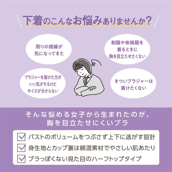 10%OFF【メール便(30)】 ルシアン LECIEN 部活ブラ 胸を目立たせにくいブラ ノンワイヤー ハーフトップ M L LL キッズ ジュニア 女の子 単品 レディース 全3色 M-LL