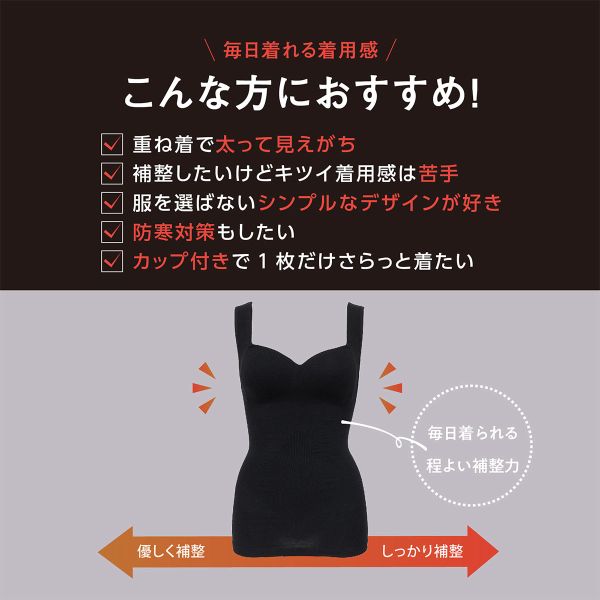 サイズ レディースM(バスト79-87cm)L(バスト86-94cm)LL(バスト93-101cm) カラー BK-ブラック、BRG-ブラウングレー、LV-ラベンダー 素材 レーヨン65% ナイロン30% ポリウレタン5% 仕様 ・ミディアムパワー・カップ付き・パッド取り外し不可・身丈:Mサイズ約54cm、Lサイズ約55cm、LLサイズ約57cm(置き寸法) 関連ワード 240930 ラン型 ボディシェーパー ボディーシェイパー ボディスーツ ボディシェイプ くびれの魔法 カップ付き パッド付き パット付き ブラトップ 補整下着 補正インナー 補整アイテム 着圧下着 着圧インナー あったかインナー 暖かい 防寒インナー 女性用 婦人用 1-sa エビデンス メーカー希望小売価格はメーカー商品タグに基づいて掲載しています⇒エビデンス画像はコチラ おすすめ商品はコチラ☆ ルシアン 細くみせるインナー パワーシェイプ タンクトップ インナー M L LL シェイパー 裏パイル 成型 LECIEN PowerShape ルシアン 細くみせるインナー 長袖 インナー M L LL シェイパー 裏パイル 成型 LECIEN PowerShape このアイテムによく似たアイテム ルシアン LECIEN PowerShape1,771円10%OFF ルシアン 細くみせるインナー パ1,782円 ルシアン LECIEN PowerShape1,500円10%OFF ルシアン 細くみせるインナー 長2,178円10%OFF ルシアン 細くみせるインナー メ1,980円10%OFF ルシアン LECIEN Powe1,782円10%OFF ルシアン LECIEN Powe1,980円10%OFF ルシアン LECIEN menc1,980円10%OFF ルシアン LECIEN menc2,277円このアイテムを買った人におすすめのアイテム ルシアン LECIEN PowerShape1,771円 ワコール Wacoal ウイング Wing 3,168円20%OFF ワコール Wacoal ウイング1,320円ショップトップ > カテゴリトップ > すべて > インナーウェア > タンクトップ・ノースリーブルシアン 細くみせるインナー カップ付 タンクトップ Daily Liner シェイパー M L LL 裏パイル 成型 LECIEN PowerShape下から上にはいて整う、つけた瞬間くびれをメイク!美姿勢サポートインナー。着るだけでキュッとスリムを実感できるPowerShape(パワーシェイプ)細くみせるインナーカップ付き成形タンクトップインナーです。パワーを切り替えた、ピンポイントに引き締める設計で気になるウエスト周りをキュッと補整し凸凹段差もなめらかにします。冷えやすいお腹・背中・腰には裏パイル加工を施しているので、ふんわりぽかぽかカラダを効率よく温めます。長めの着丈とサイドには縫い目がない設計で、裾がめくり上がりにくく、ごろつきにくく快適です。 自然な丸みを作るモールドカップでブラジャーなしでもキレイなバストラインを実現。よく伸びる幅広ストラップなので肩からズレ落ちにくい仕様です。身生地はふんわりとやわらかく、なめらかな肌あたり。 このアイテムによく似たアイテム ルシアン LECIEN PowerShape1,771円10%OFF ルシアン 細くみせるインナー パ1,782円 ルシアン LECIEN PowerShape1,500円10%OFF ルシアン 細くみせるインナー 長2,178円このアイテムを買った人におすすめのアイテム ルシアン LECIEN PowerShape1,771円 ワコール Wacoal ウイング Wing 3,168円20%OFF ワコール Wacoal ウイング1,320円 アツギ ATSUGI アスティーグ ASTI495円
