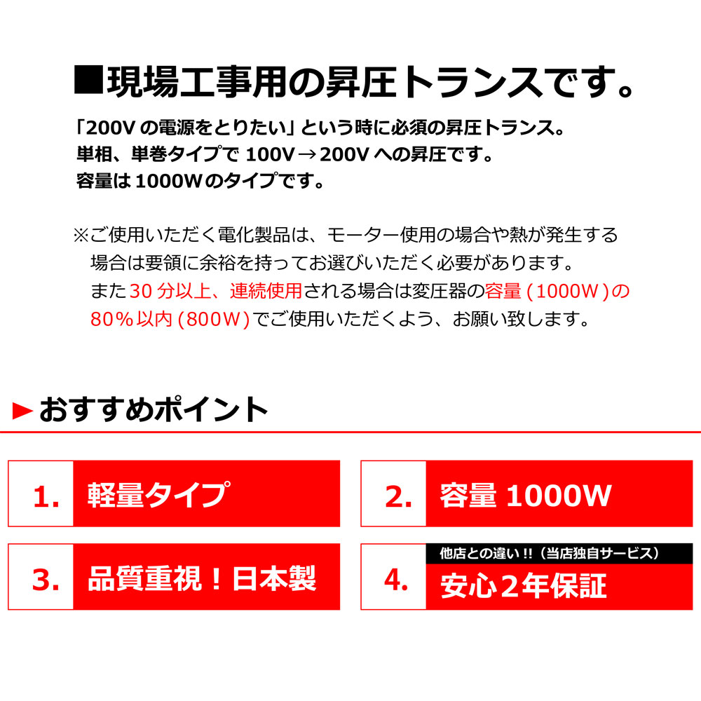現場工事用 昇圧トランス 1000W UP-100 | トロイダルトランス 日本製 アップトランス 入力100V 出力200V 単相 スワロー 正規代理店 スワロー