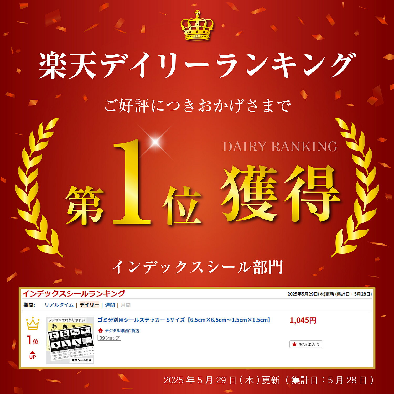 商品名 ゴミ分別用シール Sサイズ 全体サイズ 21cm×29.7cm シールサイズ 6.5cm×6.5cm~1.5cm×1.5cm 材質 ユポ溶剤強粘・透明PET強粘 梱包 OPP入れ 選べる色 透明 白 備考 お客様のモニターの発色により実物と色の見え方の違いがある場合がございます。あらかじめご了承ください。 領収書が必要なお客様へ 領収書はお客様による発行をお願いしております。 ・楽天IDを利用したお買い物の場合は購入履歴一覧から、 ・楽天IDとパスワードを利用せずに注文した場合は、ご注文内容確認ページから「注文詳細を表示」を押します。 ご購入金額の下に「領収書を発行する」というボタンがありますので、そちらから印刷をお願いいたします。 詳しくは下記のヘルプをご確認ください。・領収者(楽天)名義の領収書の発行Sサイズがランキング1位を獲得しました ゴミ分別用シールステッカーSサイズ 6.5cm×6.5cm~1.5cm×1.5cm 燃えるゴミ、燃えないゴミ、缶、ペットボトル、プラスチック、紙類、生ごみ、空き瓶といった一般的なゴミのカテゴリーを明確に区分けするためのイラストと、それぞれの英語・日本語表記が併記されています。防水加工が施されているため、キッチンやバスルームなど水回りでも使用可能です。便利なゴミ出し日を示すミニシール付き。