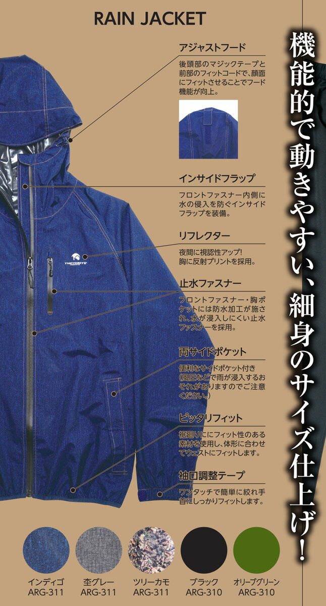 商品バリエーション ジャケット・パンツセット ジャケットのみ パンツのみ この商品のポイント 雨の日も晴れの日も全天候対応、機能的で動きやすい、 水の侵入をしっかり防ぎ、透湿性でムレを軽減!動きやすい全方位ストレッチ生地を使用 ■ジャケット ●タテ、ヨコ、斜めに自由に伸縮するストレッチ生地を使用し動きやすい ●透湿性能5000g/m2/24hの生地を使用し、内部のムレを軽減します。 ●耐水圧12000mmの高防水機能に加え、フロント・左胸部に止水ファスナーを使用し水の侵入を防止 ●TPUラミネート生地を使用し、軽量化で着用による疲れを軽減 ●胸部分に反射ロゴをプリントし、夜間の視認性を高める。 ●便利な両サイドポケット ●袖口には、ワンタッチ袖口調整テープ付き ●縫製部分は水の侵入を防ぐシームテープ加工 ●細身のサイズ仕上げ ■パンツ ●ウエストゴムは調整紐付きでジャストフィット ●左ひざ上に反射ロゴをプリントし、夜間の視認性がアップ ●縫製部分は水の侵入を防ぐシームテープ加工 ●裾部分は、ボタンで絞り調整ができます。 ●細身のサイズ仕上げ ※本製品はストレッチ性能を損なわないよう、上下とも内側にメッシュ素材を使用しておりません。 商品詳細 数 量 1着(ジャケット・パンツセット) サイズ M・L・LL・3L 品 質 表生地/ポリエステル100% 裏生地/ポリウレタンラミネート 耐水圧12,000mm以上 透湿5,000g/m2/24h以上 ※上下とも裏地メッシュ仕様ではありません カラー インディゴ・杢グレー・ツリーカモ・ブラック・オリーブグリーン メーカー 株式会社アクセス 注意事項 商品開封及びご使用後の返品・交換はできません。 メーカー欠品により商品をご用意できない場合は、その旨ご連絡をいたします。 商品画像はイメージであり実際の商品とはカラー等が異なって見える場合があります。4WAYストレッチ レインジャケット 雨の日も晴れの日も全天候対応 水の侵入をしっかり防ぎ 透湿性でムレを軽減 動きやすい全方位ストレッチ生地仕様