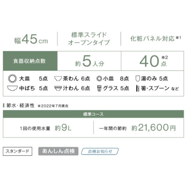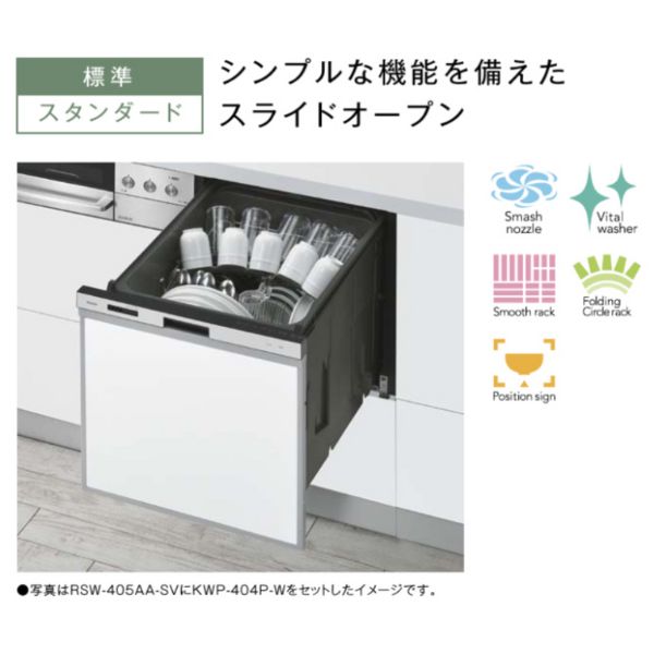 ●より見やすく、使いやすいスタイリッシュなデザインへ 庫内が見やすいカゴ 色水槽庫内色はラックと色の明暗が異なるダークグレーを採用。 ラックのピンが見やすく、食器や調理器具がセットしやすくなりました。 ●高い洗浄効果でしつこい汚れもすっきりキレイに 勢いある水流で汚れを狙い落とす「スマッシュ洗浄ノズル」 ノズル穴を従来サイズより小さくし、穴数を見直した新ノズル。 使用水量を抑えながらも、勢いある水流が庫内のスミズミまで行き届き、汚れを落とします。 上カゴに干渉せず、食器セットの自由度も向上しました。 従来ノズルより騒音も低減します。 型式:RKW-405A 当店取り扱いバリエーション 食洗機 食洗器 標準 ビルトイン コンパクト スライドオープン スタンダード 交換 ドアパネルタイプ 黒 幅45cm 奥行65cm 5人分 商品のみ