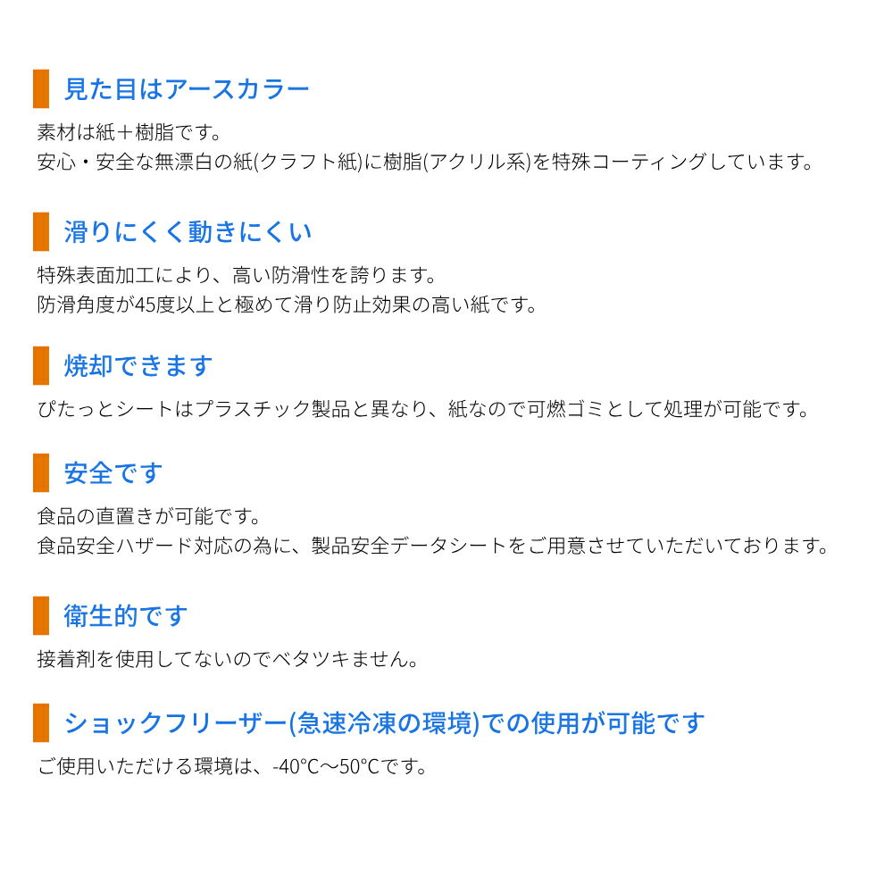 ■シートサイズ:335mm×525mm ■入数:200枚 ●見た目はアースカラー 素材は紙+樹脂です。 安心・安全な無漂白の紙(クラフト紙)に樹脂(アクリル系)を特殊コーティングしています。 ●滑りにくく動きにくい 特殊表面加工により、高い防滑性を誇ります。 防滑角度が45度以上と極めて滑り防止効果の高い紙です。 ●焼却できます ぴたっとシートはプラスチック製品と異なり、紙なので可燃ゴミとして処理が可能です。 ●安全です 食品の直置きが可能です。 食品安全ハザード対応の為に、製品安全データシートをご用意させていただいております。 ●衛生的です 接着剤を使用してないのでベタツキません。 ●ショックフリーザー(急速冷凍の環境)での使用が可能です ご使用いただける環境は、-40℃〜50℃です。