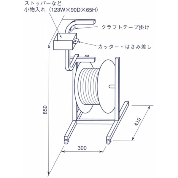 さまざまな商品の梱包作業に最適です。 荷造り・梱包する時、近くに置いておくと便利です。 スプリングストッパーによってドラムの回転を調整し、 PPバンドのたわみを防ぎます。 ※PPバンド 手締め 1,000m巻専用※ …バンドのロールの穴部分が内径約10cm以上でしたら取り付け可能です。 ●スチール製(白粉体塗装仕上) ●キャスター:双輪40φ4個、内2個ブレーキ付 ●寸法:W300mm×D410mm×H850mm ●重量:約7.2kg ※商品画像に一緒に写っている「PPバンド、ストッパー、クラフトテープ、カッター」は付属しません。