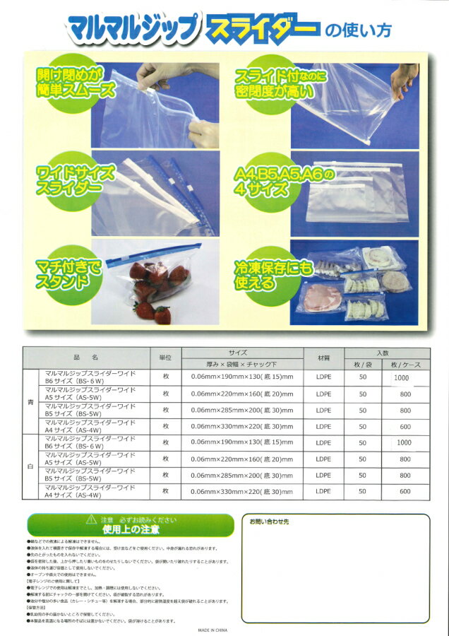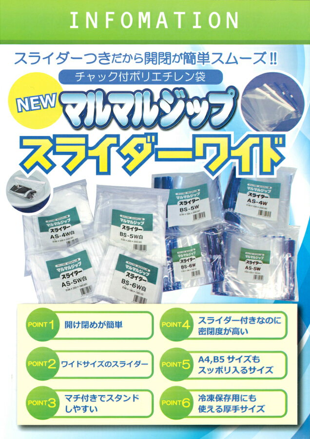 チャック付ポリエチレン袋 マルマルジップ スライダーワイド 使いやすさのポイント ●開け閉めが簡単 ●ワイドサイズのスライダー ●マチ付きでスタンドしやすい ●スライダー付きなのに密閉度が高い ●A4、B5サイズもスッポリ入るサイズ ●冷凍保存用にも使える厚手サイズ 使い方いろいろ ●開け閉めが簡単スムーズ ●ワイドサイズスライダー ●マチ付きでスタンド ●スライド付なのに密閉度が高い ●A4、B5、A5、A6の4サイズ ●冷凍保存にも使える