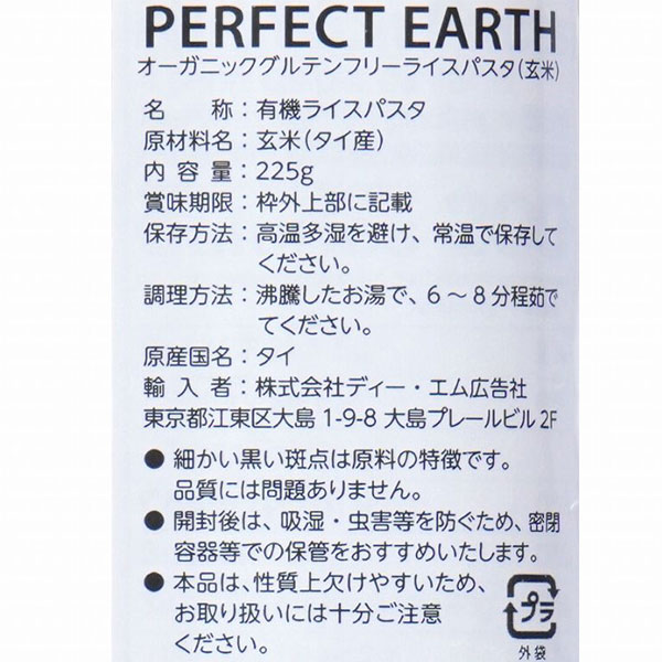 タイで無肥料・無農薬で栽培されたオーガニック米と水のみで作られた玄米パスタ有機JASをはじめ、エコサート、USDAオーガニックと様々なオーガニックの認証や、ヴィーガン、コーシャ認証も取得しており、小さなお子様からご年配の方まで安心してお召し上がりいただけます。ライスパスタ専用工場で製造されているため、特定原材料などアレルゲン混入の心配はございません。【ご使用方法】沸騰したお湯で、6〜8分程茹でてください。※細かい黒い斑点は原料の特徴です。品質には問題ありません。※開封後は、吸湿・虫害等を防ぐため、密閉容器等での保管をおすすめいたします。※本品は、性質上欠けやすいため、お取り扱いには十分ご注意ください。商品詳細商品番号sk140254原材料精米(タイ産)内容量225g栄養成分表示(1食(56g)あたり)エネルギー:195kcal、たんぱく質:4g、脂質:1.4g、炭水化物:40g、糖質:37.6g、食物繊維:2.4g、食塩相当量:0g賞味期限製造日より720日保存方法高温多湿を避け、常温で保存してください原産国タイ販売元株式会社ディー・エム広告社(PERFECT EARTH 輸入総代理店)広告文責有限会社自然館 0957-22-8770【関連ワード】玄米パスタ,お米スパ,お米パスタ,玄米スパゲティー,ライスパスタ[グルテンフリーヌードル]GFヌードル,グルテンフリー麺,GF麺,米麺,アレルギー対応麺,ヘルシー麺,代替麺,米の麺,ライスヌードル,ライス麺,ライスめん[パスタ]スパゲッティ,スパゲティー,ぱすた,イタリアン[アレルギー(小麦不使用)]小麦未使用,グルテンフリー,小麦グルテン不使用,アレルギー対応,アレルギー対策[菜食主義]ベジタリアン,ヴィーガン,ビーガン,Vegan,ビーカン,ヴィーカン[有機]有機JAS認定,オーガニック,JAS認定,オーガニック栽培,有機栽培 [販売]株式会社ディー・エム広告社(PERFECT EARTH 輸入総代理店)