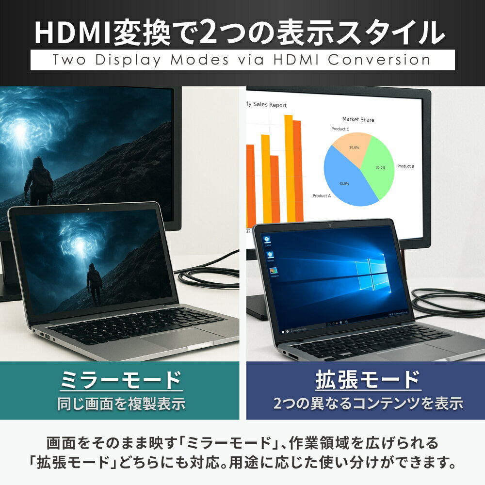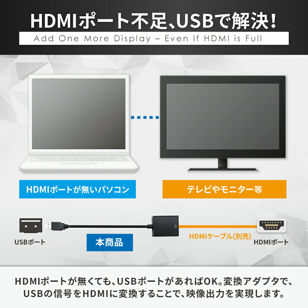【 新商品 】 USB to HDMI 変換アダプタ USB ( オス ) → HDMI A ( メス ) ■サイズ USB2.0 to HDMIケーブル 長さ:約17.2cm USB 2.0 コネクタ / HDMIコネクタ 縦 :約4.0cm / 約4.6cm 横 :約1.5cm / 約3.7cm 厚み:約0.7cm / 約1.2cm USB3.0 to HDMIケーブル 長さ:約15.6cm USB 3.0 コネクタ / HDMIコネクタ 縦 :約4.8cm / 約5.3cm 横 :約1.5cm / 約3.8cm 厚み:約0.8cm / 約1.3cm ■カラーバリエーション ブラック USBポートに差し込むだけで、HDMI出力が可能に! 映像も音声も簡単にテレビやモニターへ出力頂けます。 ■USB to HDMI 変換アダプタ の特徴 ・用途に合わせて選べる2タイプ展開 = 使用シーンに合わせて最適なタイプをお選びいただけます 1.【 USB2.0対応 タイプ 】 … 映像出力に特化したベーシックモデル、会議などにおすすめです 2.【 USB3.0対応 タイプ 】 … より滑らかな映像表示が可能な高速転送モデル、動画再生に最適 ・HDMIポート不足をUSBで解決 = HDMIが足りないノートPCでもUSBポートから映像出力を実現 拡張モニターやTVにも接続可能です ・映像も音声も同時に出力 = 映像だけでなく音声も出力可能、動画やプレゼン再生に対応します ・幅広いデバイスに対応 = PC・ゲーム機など、HDMI出力に対応した様々な機器に接続可能 ・差し込むだけで簡単接続 = USBポートに挿すだけで、HDMI対応機器へ映像・音声出力が可能 ・コンパクトで扱いやすい設計 = 軽量でポーチやポケットに収まり、持ち運びにも最適です ■製品仕様 素材:PVC、金メッキ 仕様:USB to HDMI…フルHD 【注意事項】 ※本製品はUSB→HDMI方向の変換のみに対応しています。 逆方向の変換は不可ですので、ご注意下さい。 ※接続機器によりご使用いただけない場合がございます。 ご購入前に端子形状をご確認下さい。 ※本製品と他アダプタを併用し使用した場合、保証対象外となります。 ※モニター一体型PCを外部映像出力用の モニターとして使用することはできません。 ※生産時期により、外観が若干異なる場合がございます。 ・純正もしくは各種規格に沿った機器でご使用下さい。 ・5℃ー40℃以外の低温・高温となる場所や、 多湿の場所では使用しないで下さい。 ・本製品は屋内用ですので屋外では使用しないで下さい。 ・本製品を水や汗で濡らさないで下さい。 ・過度な衝撃・無理な力は避けてください。 ・ケーブル根元付近などに極端な曲がりを与えないで下さい。 ・お使いの機器のコネクタ形状と合っているか ご確認の上、ご購入下さい。 ・ケーブルを抜き差しする際は、コネクタ部(プラグ)を持って下さい。 ・本製品を分解したり、加工しないで下さい。 ・本来の目的以外には使用しないで下さい。 製品の色味に関しては、お使いのデバイスの表示性能や設定により 変化する可能性がありますのでご注意ください。 品質・検品には万全を期しておりますが、万一商品に 不具合等御座いましたらカスタマーまでご連絡お願いいたします。 お客様に満足して頂きたく品質改善を日々しております。 それに伴い予告なしにデザインが変更する場合がございます。 ご了承くださいませ。随時商品ページにてお知らせいたします。 ■関連キーワード 変換アダプタ アダプタ 変換器 変換ケーブル USB HDMI hdmi USB3.0 USB2.0 テレビ 接続 ノートパソコン PC Apple MacBook Mac windows TV モニター ディスプレイ ゲーミングモニター TV プロジェクター 取り付け簡単 差し込むだけ 薄型 軽量 コンパクト デザイン 持ち運び 動画 映像 コード 投影 出力ケーブル ミラーリング データ転送 在宅ワーク テレワーク zoom 遠隔授業 テレビ会議 リモートワーク 大画面 オンライン飲み会 リモート授業 おしゃれ オシャレ メーカー希望小売価格はメーカー商品タグに基づいて掲載していますTP99