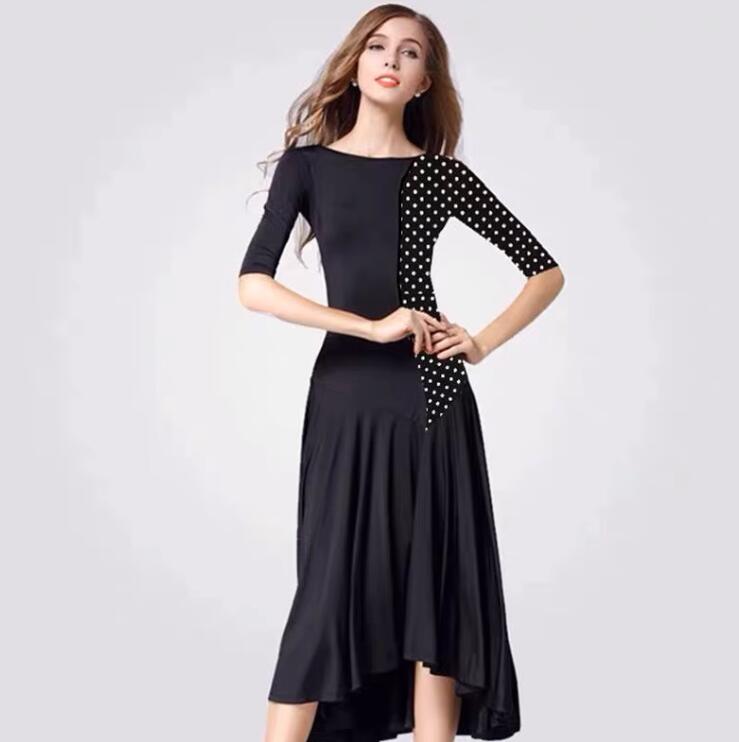 【送料無料】社交ダンス衣装 ダンスドレス 黒 ドット柄 水玉 袖あり 大きい裾 高級感 発表会ドレス ダンスウェア スタンダードドレス 上質 競技ドレス ワルツ ルンバ サンバ ラテンダンス 団体ウエア トレーニング ワンピース 練習服 演出 ステージ パーティー モダンダンス