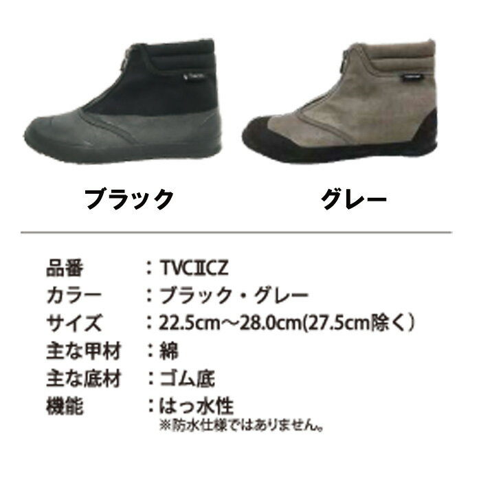 ・TYPE:ファスナー ・品 番 :TVCIICZ ・カラー:  ブラック・グレー ・主な甲材:綿(はっ水加工)  ※防水仕様ではありません ・主な底材:ゴム底 ※商品の写真はお客様のモニター環境や撮影時のライティングの関係等により実物と若干異なることがございますので予めご了承下さい。 メーカー希望小売価格はメーカーサイトに基づいて掲載しています