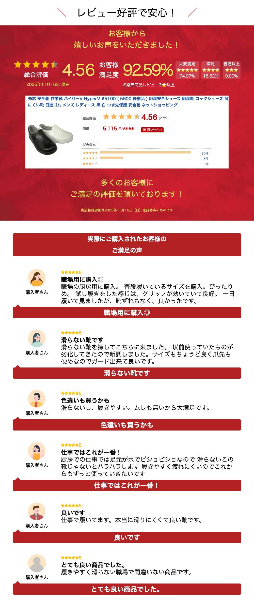 メーカー希望小売価格はメーカーサイトに基づいて掲載しています。 ↑クリックすると拡大画像が開きます。 商品名 ハイパーV5100 厨房シューズ ( 5600 後継品 ) サイズ 22cm、22.5cm、2cm、23.5cm、24cm、24.5cm、25cm、25.5cm、26cm、26.5cm、27cm、28cm、29cm メンズ(男性)・レディース(女性)ともにOK!小さいサイズ(スモールサイズ)から大きいサイズ(ビックサイズ)まで揃っています! 340g(26.0cm片足) カラー 白、黒 メーカー 日進ゴム 株式会社 形状 アッパー材:合成皮革 ソール:ハイパーVソール 樹脂先芯 JSAA規格 耐油底 抗菌・防臭加工 足元はゆったりでクッション性も抜群 通気穴付きインソールでムレにくい #5000の先芯入りタイプ 店長からの一言 通常、水や油にぬれた場所をを歩くと、靴と接地面の間に膜ができ、靴が浮いた状態になり滑ってしまいます。 ハイパーVを使った靴底は滑る原因となる膜ができにくいため、ガッチリと地面にグリップします。 水・油で滑りやすい厨房やビルメンテナンスなど洗剤・ワックスで足元が不安定な場所に、「HyperVソール」は威力を発揮。 樹脂先芯付の安全靴仕様です。 樹脂先芯付なしはこちら ハイパーVシリーズ一覧 ソール仕様 形状 安全靴/非安全靴 こんなシーンに便利 作業で求められる動作にあった着心地」と「長時間の着用にも快適な着心地」を追求した作業着です。 作業服・作業着 一覧 農作業・土木作業・建築作業等の必須アイテム。 用途に合わせて多数用意しています。 各種手袋 一覧 滑らない靴・ハイパーVソール等、機能性抜群の安全靴。 長靴・安全靴 一覧 関連商品長靴厨房シューズ コックシューズ ハイパーV #4200 フード付長靴...粉用 厨房シューズ ハイパーVソール搭載 Hyperv#5740 日進...ハイパーV4500 鉄先芯 安全長靴 作業靴 厨房シューズ コックシュ...4,620円5,335円5,577円ハイパーV4000Z 長靴厨房シューズ コックシューズ 日進ゴムの 滑...ハイパーV #006 滑らない靴 耐滑 軽量 スニーカー ブラック H...安全靴 作業靴 ハイパーV SPIDER MAX #6200 スパイダ...3,850円5,137円4,906円先芯 安全靴 ハイパーV HyperV #5100 ( 5600 後継品 ) 厨房安全シューズ 厨房靴 コックシューズ 滑りにくい靴 日進ゴム メンズ レディース ハイパーV5100 安全靴 厨房安全シューズ 水を弾きやすい合成皮革とハイパーVソールで安全作業 ■ お客様からよくいただく質問 ◯ Question 配送日 【指定あり】 と 【指定なし】 、どちらが早く届きますか? ◯ Answer 配送日 【指定なし】 の方が早くお届けできます。 配送日 【指定あり】 の場合は、確実にお届けできるように最短日での発送ではなく、少し余裕をもった日付でご選択いただくようにしております。 そのため、お急ぎの場合は配送日 【指定なし】 または備考欄へお急ぎの旨ご連絡下さい。