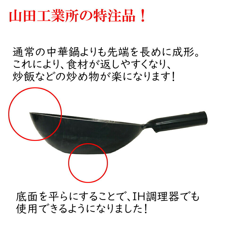 山田工業所 調理電磁器 IH対応 鉄 打出 片手 1.6mm 中華鍋 30cm(底平返し)/日本製 国産品 職人技 北京鍋 片手鍋 定番 ロングセラー 軽い 丈夫 頑丈 ハンドメイド ニスなし 空焼き不要 家庭用 レストラン ラーメン店 炒飯 御祝 誕生日祝い 還暦祝い ギフト プレゼント