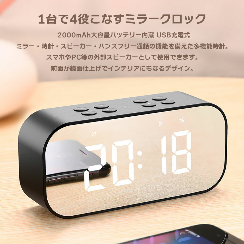ミラー クロック ワイヤレス スピーカー Bluetooth接続 時計 アラーム 鏡面 ワイヤレススピーカー USB充電式 2000mAh 軽量 小型 マイク内蔵 ハンズフリー通話 ブルートゥース スマホ MicroSD対応 MP3再生 ◇ALW-BT501-K【メール便】 | デジタル 多機能 デジタル時計 置き時計