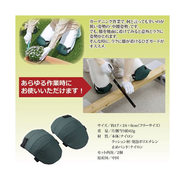 ■商品内容【ご注意事項】・この商品は下記内容×5セットでお届けします。●膝を着けば、中腰姿勢で苦しむことはありません!ガーデニング作業で、何と言っても辛いのが低い姿勢の「中腰姿勢」です。でも、膝を地面に着けてみると意外とラクに姿勢がとれます。そんな時に、ラクに膝が着けるひざガードがオススメ。■商品スペック●サイズ:約17×24×6cm(フリーサイズ)●重量:約42g●材質:本体/ナイロン クッション材/発泡ポリエチレン 止めバンド/ナイロン●セット内容:2個●生産国:中国●パッケージサイズ:20×35×11cm 130g■送料・配送についての注意事項●本商品の出荷目安は【4 - 7営業日 ※土日・祝除く】となります。●お取り寄せ商品のため、稀にご注文入れ違い等により欠品・遅延となる場合がございます。●本商品は仕入元より配送となるため、沖縄・離島への配送はできません。[ 810300 ]