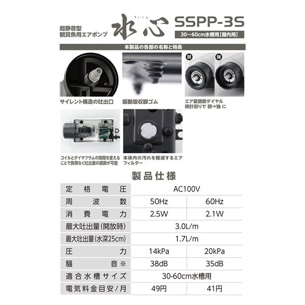 ■サイズ・色違い・関連商品■SSPP-7S■SSPP-3S[当ページ]■商品内容静かさと力強さの両立にこだわって開発された国内最高峰のエアポンプです。2ヶのダイヤフラムを使用することにより振動を打ち消しあうのと同時に水作独自の振動吸収脚ゴムによって周囲へ振動を伝えないことにより大幅に静音化された水心ならではの工夫が凝らされています。自由にエア量が調節できるダイヤル機構が採用されています。■商品スペック■材質/素材本体:ABS ユニット:(ダイヤフラム:EPDM、弁:Si、振動板:SECC) 脚ゴム:EPDM エアフィルター:ウール■原産国または製造地日本■諸注意・本製品は観賞魚飼育専用です。その他の目的では使用しないでください。 ・本製品は屋内専用です。屋外では使用できません。 ・雨、雪のかかる場所やふろ場などの湿気の多い場所では使用しないでください。 ・誤って本製品を水中に落としたときは、速やかに電源コンセントから電源プラグを抜いてください。なお再使用することはできません。 ・ぬれた手で電源プラグの抜き差しをしないでください。 ・時々電源コードや電源プラグを点検してください。また電源コードや電源プラグが傷んだまま使用しないでください。 ・強い衝撃を与えたり、落としたりしないでください。 ・分解して油を注いだり改造しないでください。 ・万一本製品から煙が出ていたり異臭がするなどの異常があるときは、ただちに電源コンセントから電源プラグを抜き購入店にご相談ください。 ※製品改良のため、仕様・デザインなど断りなく変更することがあります。あらかじめご了承ください。■送料・配送についての注意事項●本商品の出荷目安は【1 - 5営業日 ※土日・祝除く】となります。●お取り寄せ商品のため、稀にご注文入れ違い等により欠品・遅延となる場合がございます。●本商品は仕入元より配送となるため、沖縄・離島への配送はできません。
