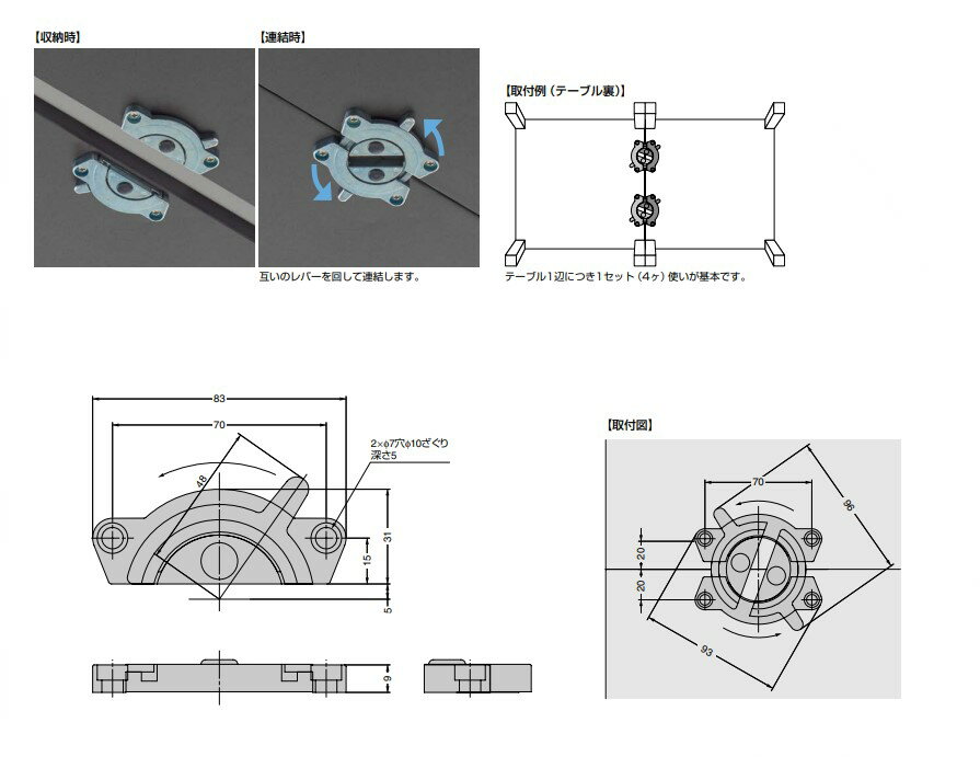 薄型タイプ(金属製) ●オス・メスの区別がなく、連結の組合せが自由です。 ●テーブル同士を連結できます。 ●亜鉛合金製のため、作業台などにもご使用いただけます。 ●連結部分は収納でき、不使用時も邪魔になりません。 【用 途】 ●テーブルや作業台など。 【注 意】 ●テーブル1辺につき1セット(4ヶ)使いが基本です。用途に合わせて取付位置と必要個数をご確認ください。 材料: 亜鉛合金 仕上: 素地 質量g: 208 ※本品はセット(4ヶ)単位での販売です。ご注文数「1」で1セットです。