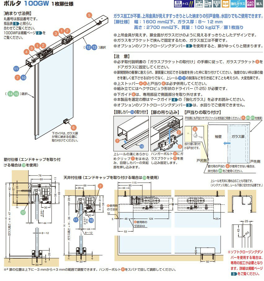 ハワ スライディング ソリューションズ ポルタ 100GW 重量用引戸 幕板付き上レール/1枚扉仕様 ガラス加工が不要。上吊金具が見えずすっきりとした納まりの引戸金物。水回りでもご使用できます。 ●上吊金具が見えず、扉全面がガラスだけのように見えるすっきりとしたデザインです。 ●ガラスをブラケットで挟んで固定するため、ガラス加工は不要です。 ●オプションのソフトクロージングダンパーを使用すると、扉がゆっくりと閉まります。 ●注意などの詳細は画像をご覧ください。 ※本商品ページは部品セットのみの販売です。レール等は別売りです。