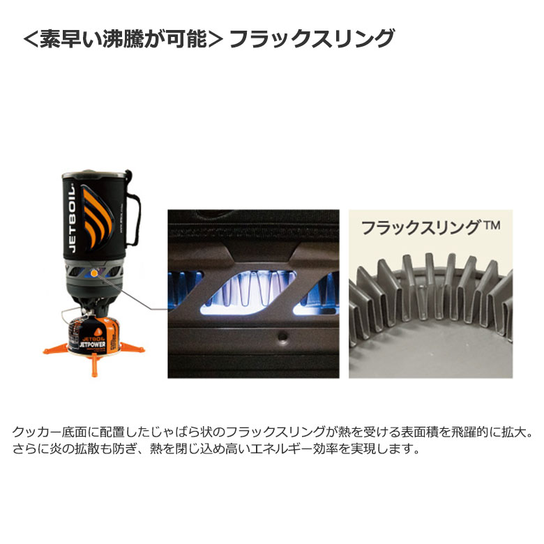 管理番号:9172 91720400 1824325◆<素早い沸騰が可能>フラックスリング クッカー底面に配置したじゃばら状のフラックスリングが熱を受ける表面積を飛躍的に拡大。さらに炎の拡散も防ぎ、熱を閉じ込め高いエネルギー効率を実現します。 ◆ジェットボイル<オール・イン・ワン & コンパクト> ジェットボイルは、すべてのパーツをクッカー本体内に収納して手軽に持ち運びができるオール・イン・ワン設計。コンパクトでひっかかり所の無い形状なので、バックパックなどに収納する際にも大変便利です。 ※アイテムによって推奨する収納方法が異なります。詳しくは、取扱い説明書をご参照ください。 ◆ゴトクを使えば、調理の幅がさらに広がる! ジェットボイル?クッキングシステム?は、付属のゴトクを使えばオプショナルクッカーやフライパン、異なるメーカーのクッカーも使用することができます。 ゴトクはオール・イン・ワンでカップの中に収納可能。(JETBOILミニモを除く) ※オプショナルクッカーや一般のクッカーを使用する際は必ずゴトクを使用してください。 ※直接クッカーを乗せるとバーナーの炎でプラスチック部分が溶けて壊れることがあります。 ◆ジェットボイル付属のゴトク 専用のクッカー以外を使用するときはこのゴトクを装着します。 足をたたむことでクッカー内に収納することができます。 ◆PSLPGマーク ■商品説明 商品名 JETBOILジップ 詳細 ジェットボイル?最大のメリットである高い熱効率はそのままに、必要最小限の機能に絞ることで高いコストパフォーマンスを実現したシンプルなモデルです。 ※点火イグナイターは付属しません。点火にはマッチ、ライターなどの火器が必要です。 [ジェットボイル?・クッキングシステム?について] クッカーと熱効率の高いストーブがセットになった簡単便利なアウトドア用調理器具。 クッカーの底のフラックスリングが抜群の熱効率を実現しています。クッカー側面を覆うクロロプレンゴム製のコジー(断熱カバー)によりヒートロスを防ぎ、調理中でもクッカーを素手で扱うことができます。カーゴコジーには、スプーン・フォークなどのカトラリーを差し込んで収納できるポケットも付いています。 カートリッジに装着して転倒を防ぐスタビライザーと、専用クッカー以外のクッカーに対応するゴトクが付属します。 ※ガスカートリッジは付属していません。 ※ガスカートリッジは、必ず専用の「ジェットパワー」をご使用ください。 ※表記スペックは日本製品の仕様です。 ※沸騰到達時間:周囲温度20℃、水温20℃、海抜64m、無風の条件下において(ジェットボイル?社調べ)。 重量 約340g (付属スタビライザー27g、ゴトク35g除く) サイズ Φ10.4cm×高さ16.5cm(収納時) 容量 0.8L 沸騰到達時間 約2分30秒(0.5L) 出力 1134kcal/h ガス消費量 約65g/h ※「ジェットパワー100G」1缶で約12Lの水を沸騰可能 素材 アルミニウム合金(クッカー本体) 注意事項 ・圧電点火装置(イグナイター)は高所や低温下では機能しないことがあるため、予備のマッチやライター(電子着火式でないタイプ)を携行してください。 ・ガスバーナーとカートリッジを接続する際は、ガスの調節つまみが閉じていることを確認したうえで「水平な場所で、すばやく、確実に」締め付けてください。 ・JETBOILの専用クッカーはバーナー点火後に、液状の食材を入れた上で取付けてください。(マイティーモは除く) ・JETBOILバーナーで一般的なクッカーを仕様する場合、必ず付属のゴトクを使用してください。(マイティーモは除く) ・ガスカートリッジを廃棄する際は、使いきった上で中身のないことを確認し、お住まいの自治体の収集方法に従ってください。 届出事業者名:mont-bell PSマークの種類:PSLPG 登録検査機関名称:JIA