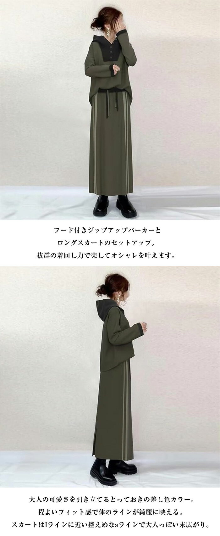 送料無料 セットアップ レディース カジュアル パーカー ロングスカート 2点セット ロングワンピース きれいめ 上品 ニットソー レディース エレガント 体型カバー 着痩せ 40代 上下セット オーバーオール カジュアル