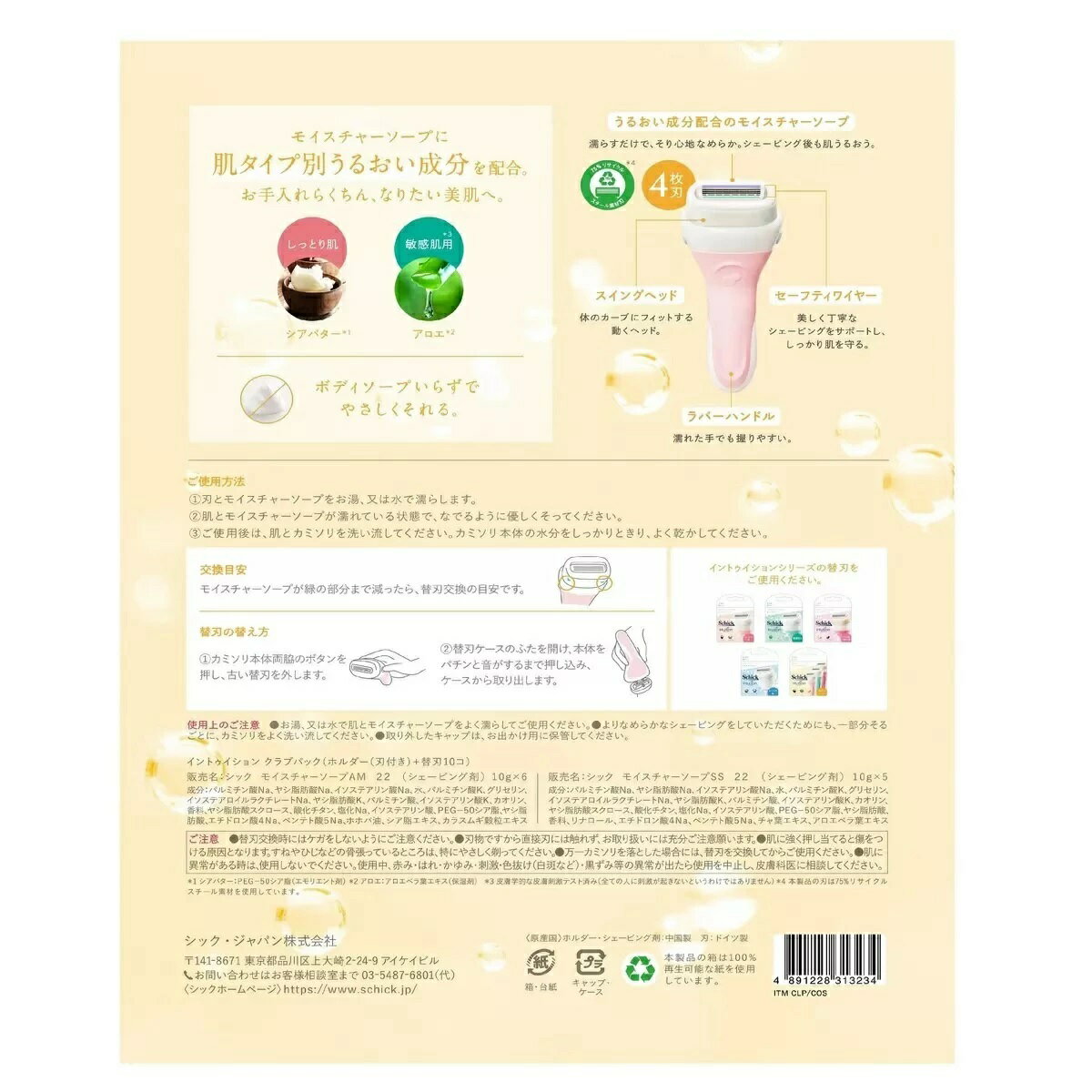 商品情報内容(1セット)本体(刃付き)・替刃10個生産本体,ソープ:中国替刃:ドイツ替刃内容(1セット)■しっとり肌(シアバター配合)×5■敏感肌(アロエ配合)×5【2セット】シック イントゥイション 本体刃付き+替刃10個 女性用 剃刀 替え刃 カミソリ かみそり シェーバー T字カミソリ レディース ソープ付き Schick Intuition 敏感肌用 しっとり肌用 ハリ うるおい 4枚刃 ボディソープなしで剃れるイントゥイション ■(本体刃付き+替え刃10個)×2セット■替え刃の内容(1セット) しっとり肌用(フローラルの香り)×5,敏感肌用(ローズの香り)×5■濡らすだけでボディソープなしで剃れる剃刀■保湿成分を配合,肌に潤いを与える2種のソープ■カーブに合わせて動くスイングヘッド4枚刃■肌に刃があたるのを最小限に抑えるセーフティワイヤー■ソープの減りに合わせヘッドの高さを調整刃付きの本体と2種のソープの替刃10個がセットとなった、合計11個の刃が付属したお買い得セット。シェーバーを濡らすだけで、ナチュラルフレグランスに包まれながら、シェービングをお楽しみ頂けます。2種類のモイスチャー美容ソープで、剃り心地なめらか。シェービング後もしっとり、お肌がうるおいます。 5