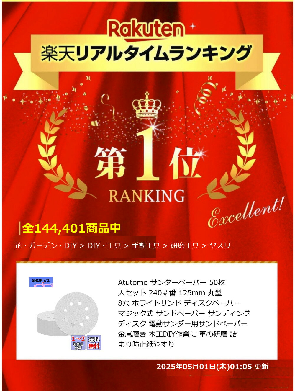 【送料無料】【楽天ランキング1位獲得】Atutomo サンダーペーパー 50枚入セット 240#番 125mm 丸型 8穴 ホワイトサンド ディスクペーパー マジック式 サンドペーパー サンディングディスク 電動サンダー