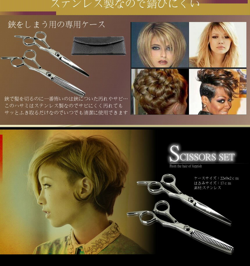 ■商品説明■ 手軽に自宅でカット♪ 美容室に行かなくても、いつでも自由にカットできます♪ 梳きばさみとのお得な2本セットです ケースサイズ:22*9*2cm はさみサイズ:17cm 素材:ステンレス セット内容:スキハサミ、カットハサミ、専用ケース説明書は付属しておりませんので、ご了承願います。 仕様・外観等は改善の為に予告なく変更する場合があります。 ■送料無料■ゆうパケット便または、定形外郵便(ポスト投函)